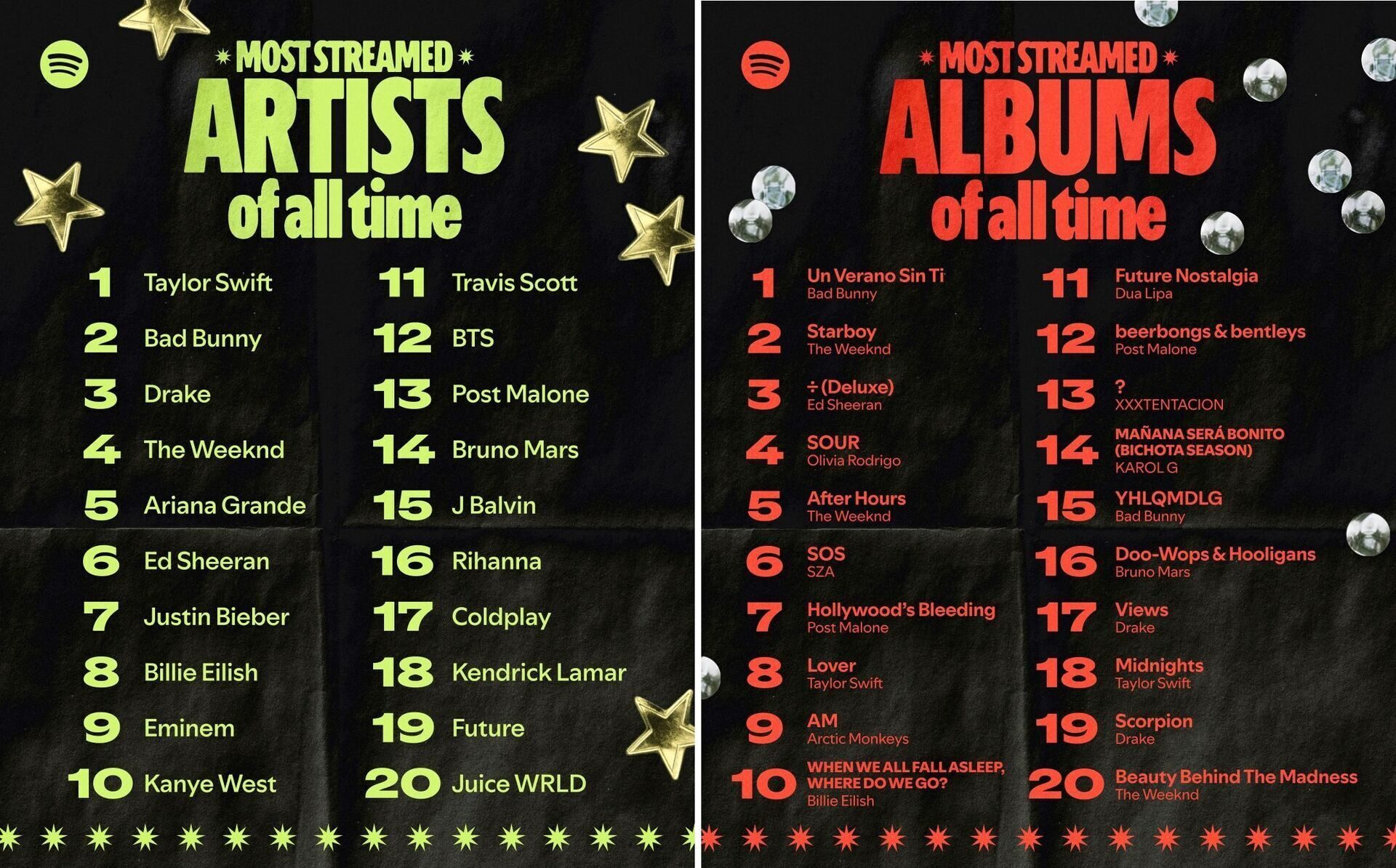 Итак, среди исполнителей наибольшее количество прослушиваний — у Тейлор Свифт. Сегмент K-pop представлен в топе одним исполнителем — BTS на 12 месте. За рок отдуваются Coldplay на 17.