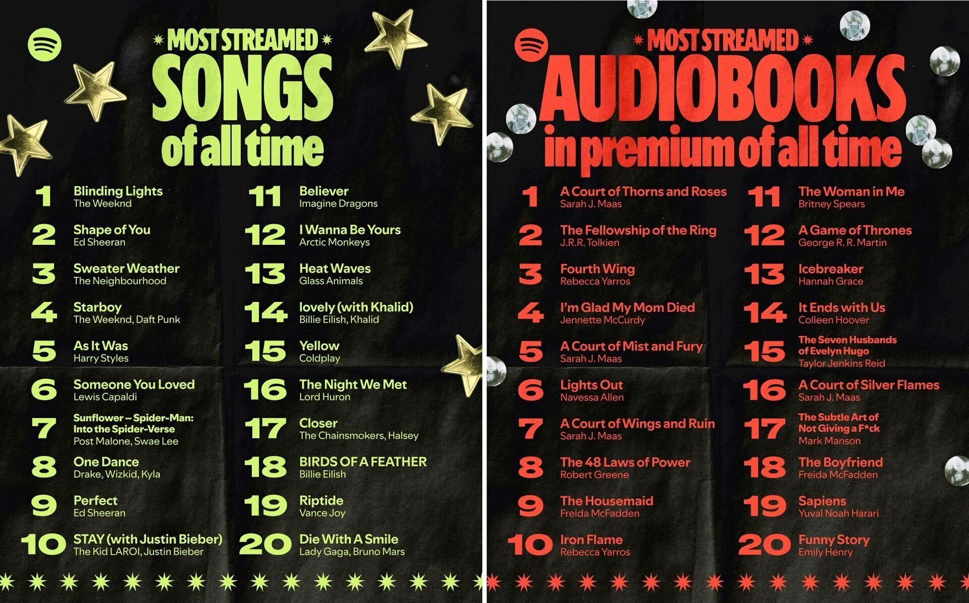 Наиболее прослушиваемый альбом — «Un Verano Sin Ti» от Bad Bunny. Наиболее прослушиваемая композиция — «Blinding Lights» от The Weeknd. В категории подкастов наибольшее количество прослушиваний у The Joe Rogan Experience. Среди аудиокниг лидирует «Королевство шипов и роз» от Сары Дж. Маас, а вот на втором месте находится «Братство кольца» Дж. Р. Р. Толкина.