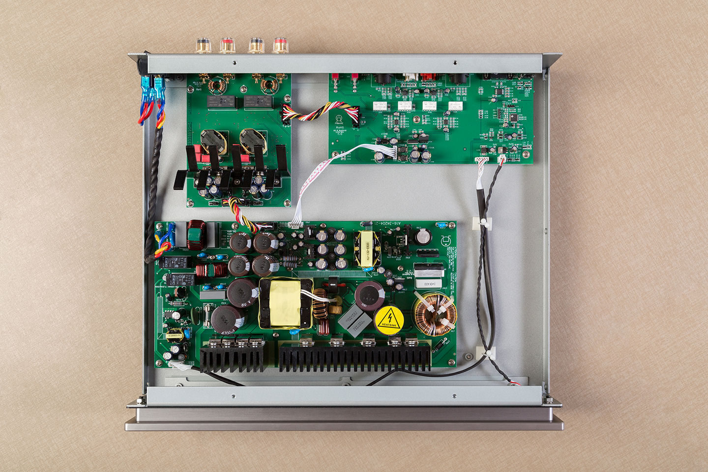 Primare A34.2 это усилитель класса D. Под капотом — всего-навсего три печатных платы довольно скромного вида. Собственно усилитель вынесен на самую маленькую плату — площадью не больше, чем экран смартфона. В более мощном Primare_A35.8 хотя бы используются УМ Hypex NC500EM, но тоже в классе D. Таким усилителям присущая жесткость звучания, ставшая уже притчей во языцех, и "металлический, цифровой привкус" в звуке (конечно это не мастерская жестянщика, но всё же). Для акустических систем, имеющих непостоянный импеданс, в связи с серьезными перепадами нагрузки, выходной каскад усилителя класса D перестает работать стабильно. Для противодействия этому вводится обратная связь во всем диапазоне рабочих частот, что делает систему восприимчивой к противо-ЭДС от громкоговорителей, приводя к снижению качества воспринимаемого звука.