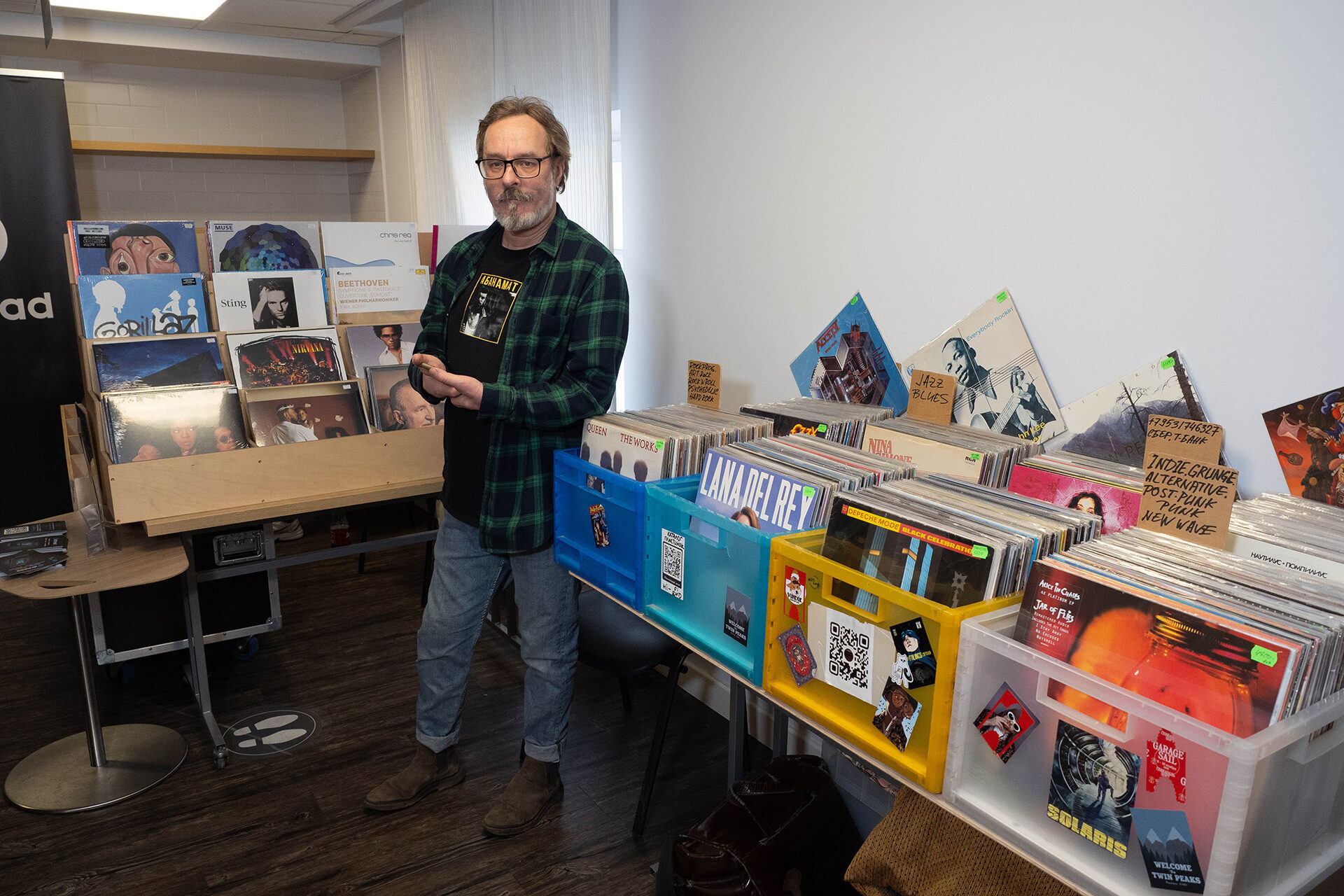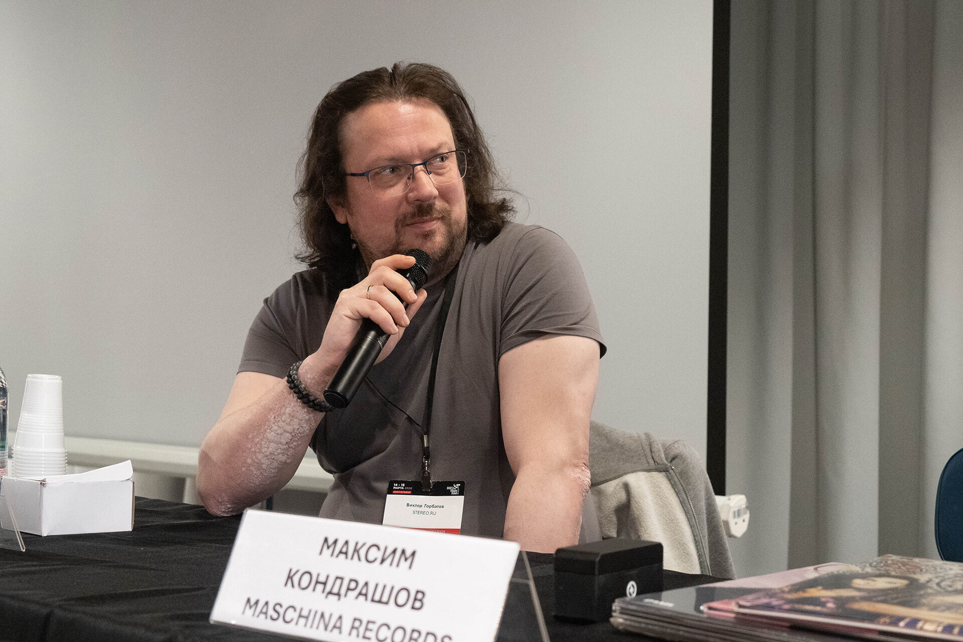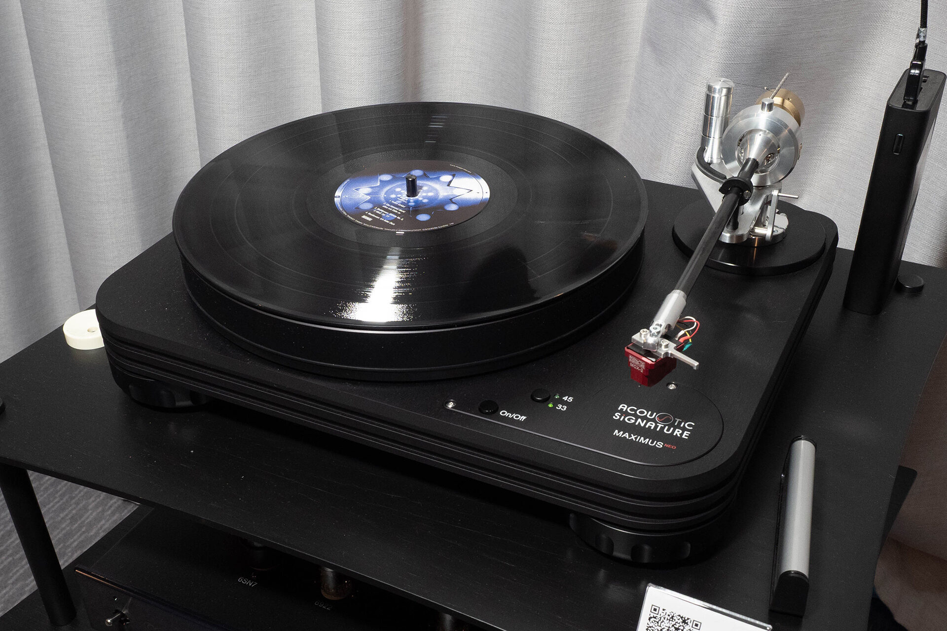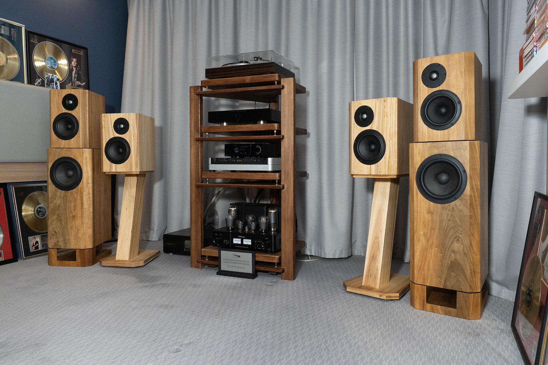 В комнате монобрендовая система, много техники: от крупной акустики до полочной (всего три модели), ламповое усиление и вертушка полностью собственной разработки с очень необычной системой виброразвязки. В общих словах подача теплая, несколько окрашенная, со своим, пожалуй, даже запоминающимся характером. Очень крупные образы сцены, звук рисуется крупными, яркими мазками.