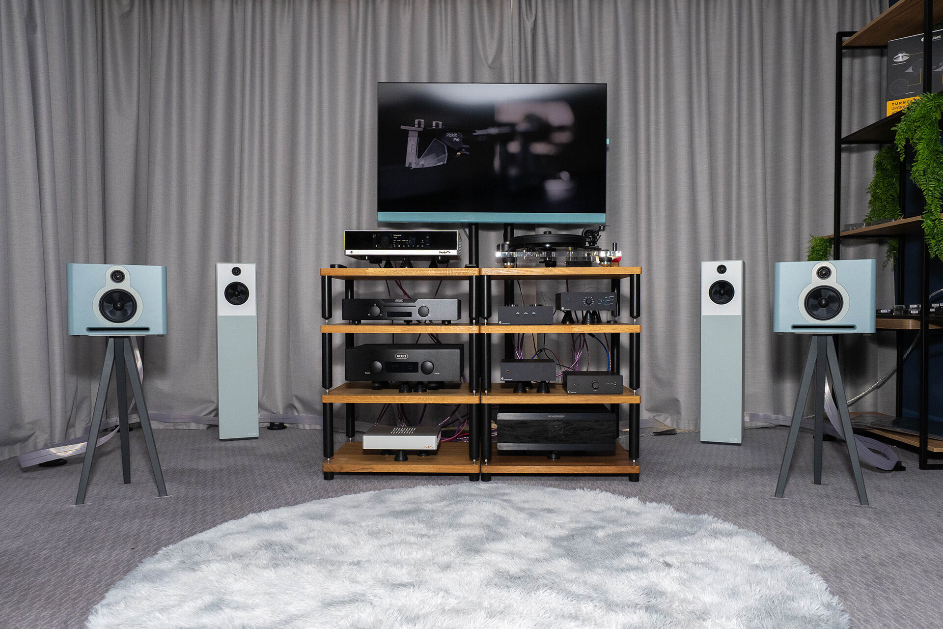 В плане системы — к акустике подобрали усиление Hegel, цифровой источник Matrix Audio, проигрыватель винила Pro-Ject с головкой Ortofon X30 из новой линейки и кабели Nordost для обвязки всей системы.