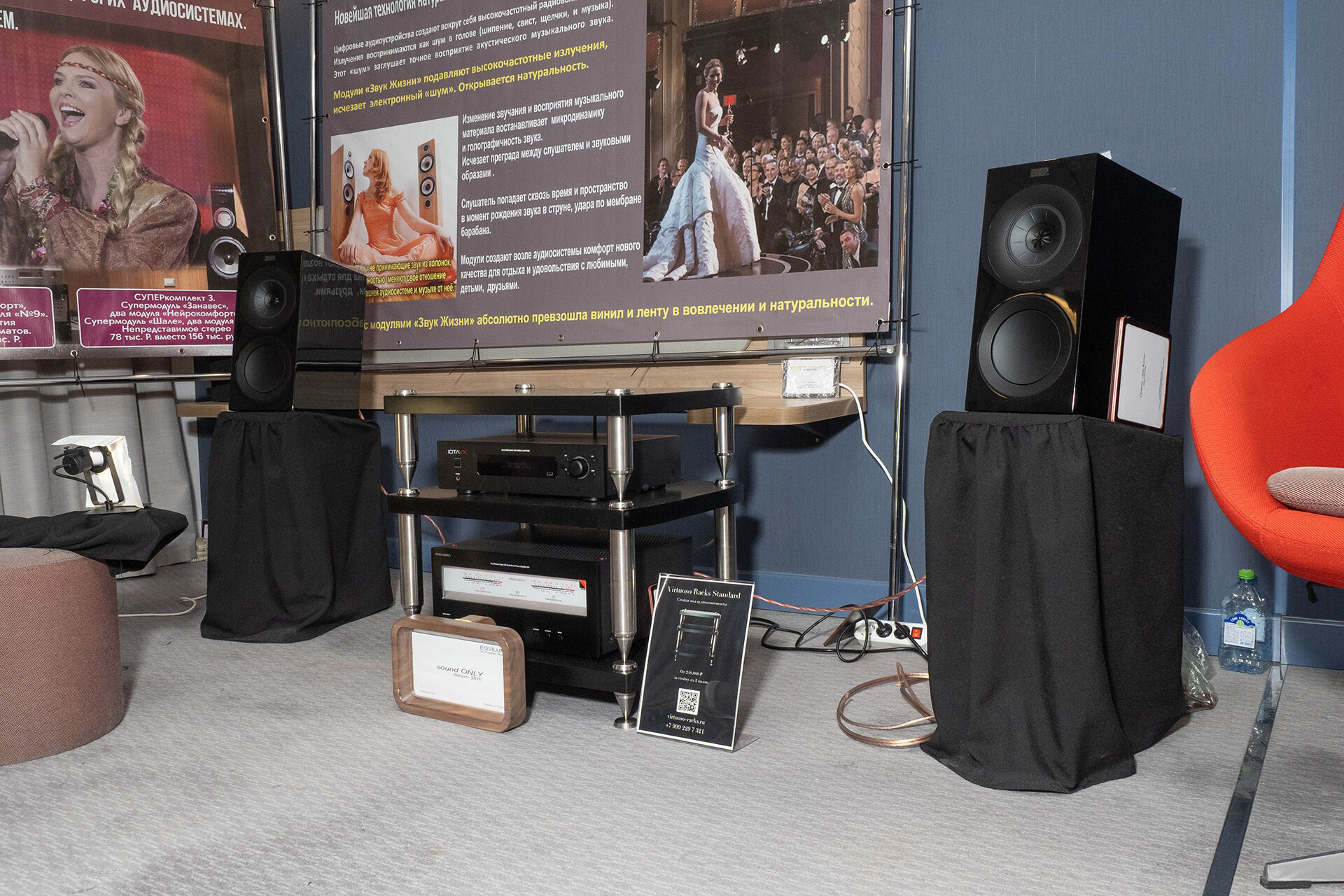 Вот тут необычное. Достаточно простая система — KEF, Premiera, Iota. Но основное — свои изделия, для демонстрации работы которых система и собрана. Некие панельки, которые можно положить на технику, на акустику. Гармонизаторы, резонаторы, поглотители — сложно понять, как охарактеризовать все это. Работать должно, убирая, как я понял, электромагнитные помехи. Попробовать почувствовать эффект можно в процессе живых демонстраций. Честно признаюсь — не понял. Много чего пробовал разного, и многое так или иначе работает, иногда даже не совсем понятно, как, но в данном же случае не могу высказать какое-то отчетливое мнение.