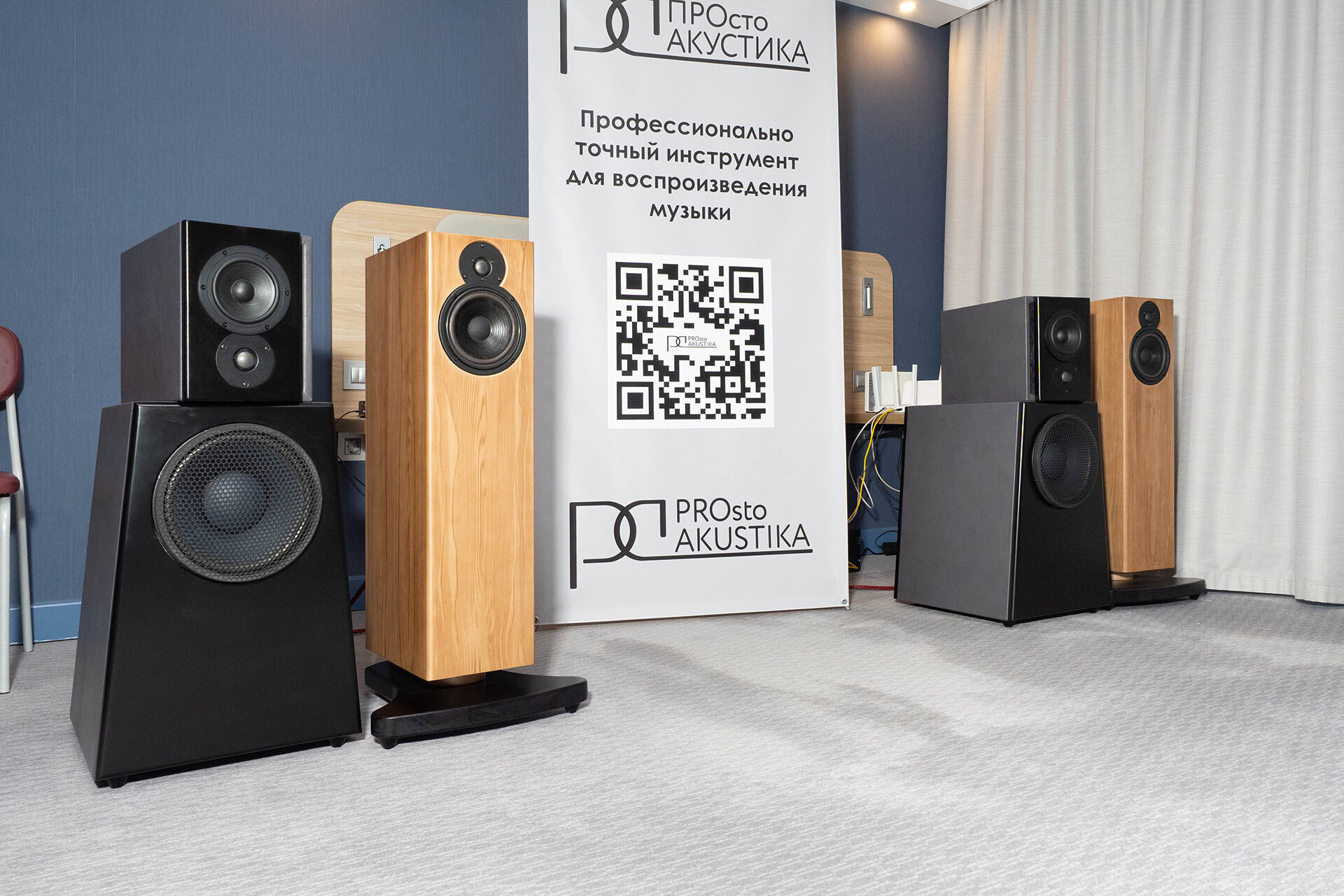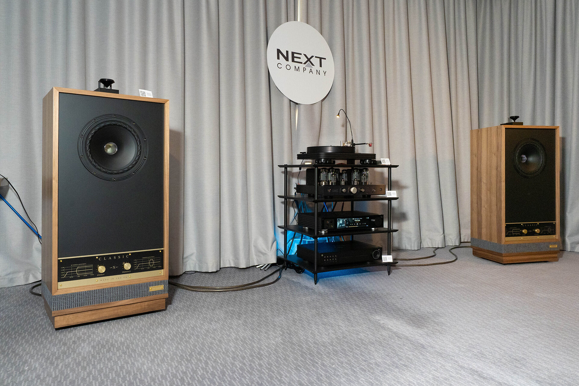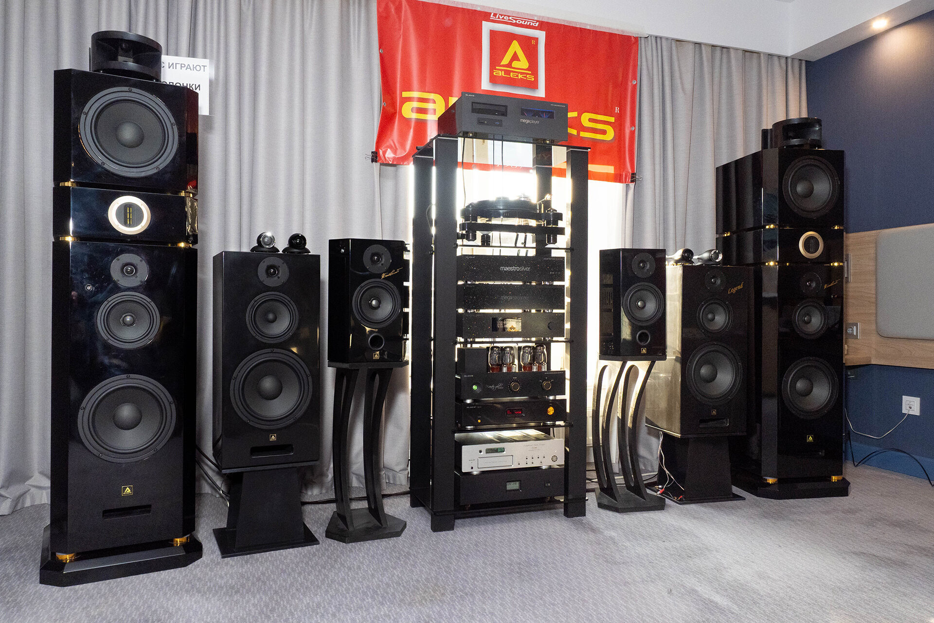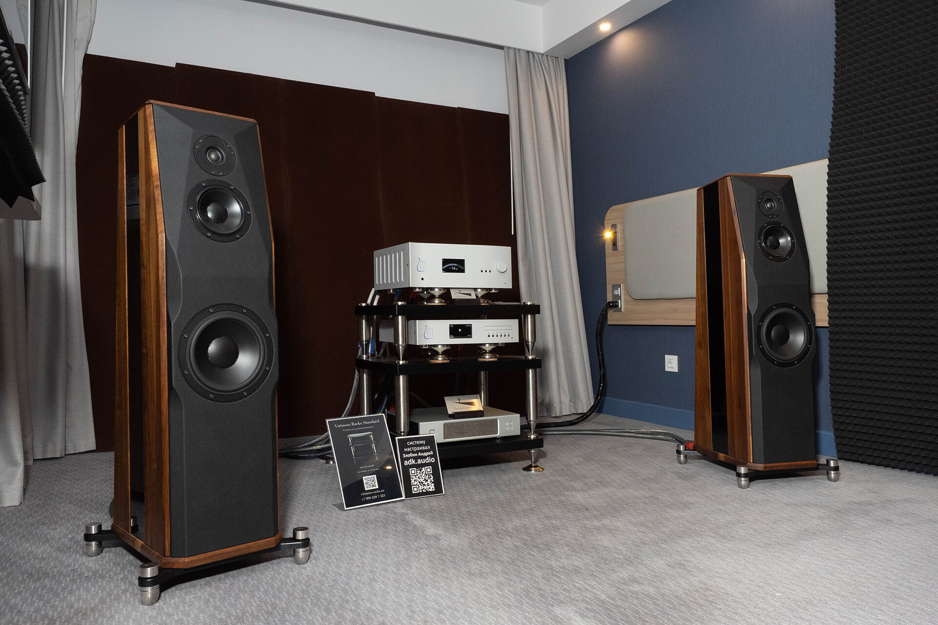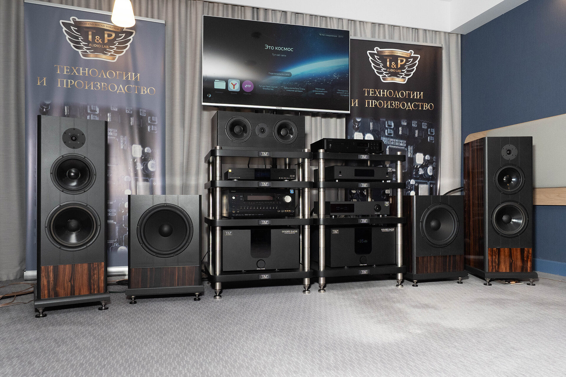 Еще один российский разработчик на выставке. Своя крупная напольная акустика, сабвуферы, внушительных размеров усиление, свой ЦАП. Внешне сделано неплохо, если к чему и придраться, так только к несуразно большим логотипам на технике — в остальном же смотрится как промышленные изделия, а не как гаражное производство. По звуку двоякие впечатления. Какой-то материал играл неплохо, а какой-то, как мне показалось, слишком жестко и ярко. В общем и целом звук был вполне масштабным, со скорее силовой подачей и желанием играть погромче.