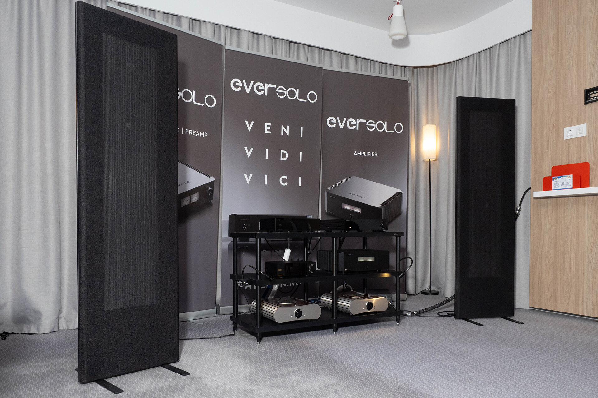 Здесь установили акустику Magnepan, подобрали к ней усиление — моноблоки Gato Audio (на удивление необычная связка по звуку, более эмоциональная, чем можно было ожидать). Пред и цифровой источник — Eversolo, именно этот производитель основной в экспозиции. Но как раз его легкая окраска и некая усиленная эмоциональность хорошо слышны. Результат можно обсуждать, но, как мне показалось, примерить на себя звук Eversolo здесь вполне можно.