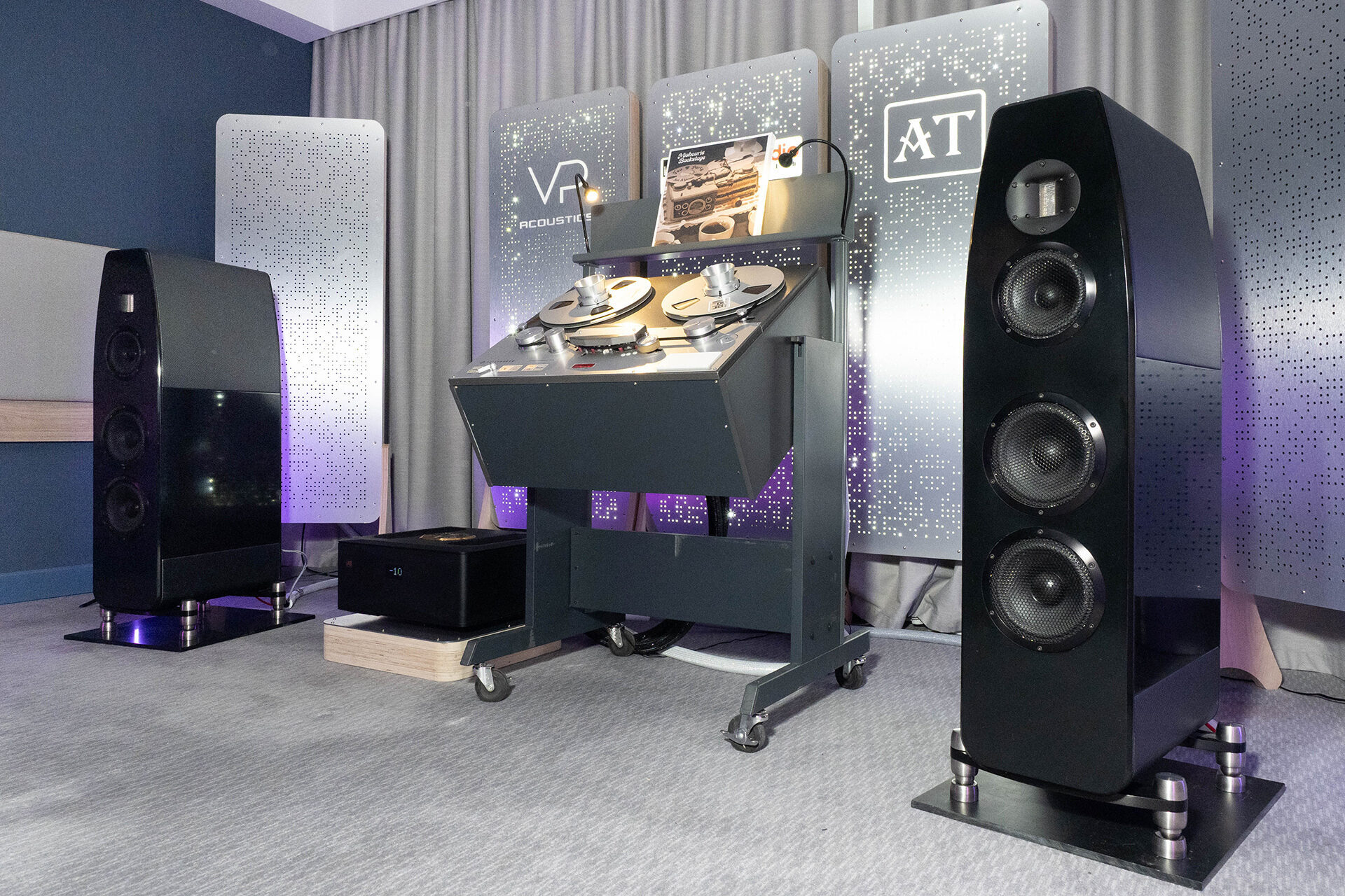 Система собрана из акустики VPAcoustics и обновленного усилителя AT-Technologies. В качестве единственного источника — катушечный Telefunken и свои ленты студии Smart Audio Recording Lab. Звук очень естественный, совершенно не зажатый. Пожалуй, один из самых интересных на выставке, если смотреть по балансу качеств.