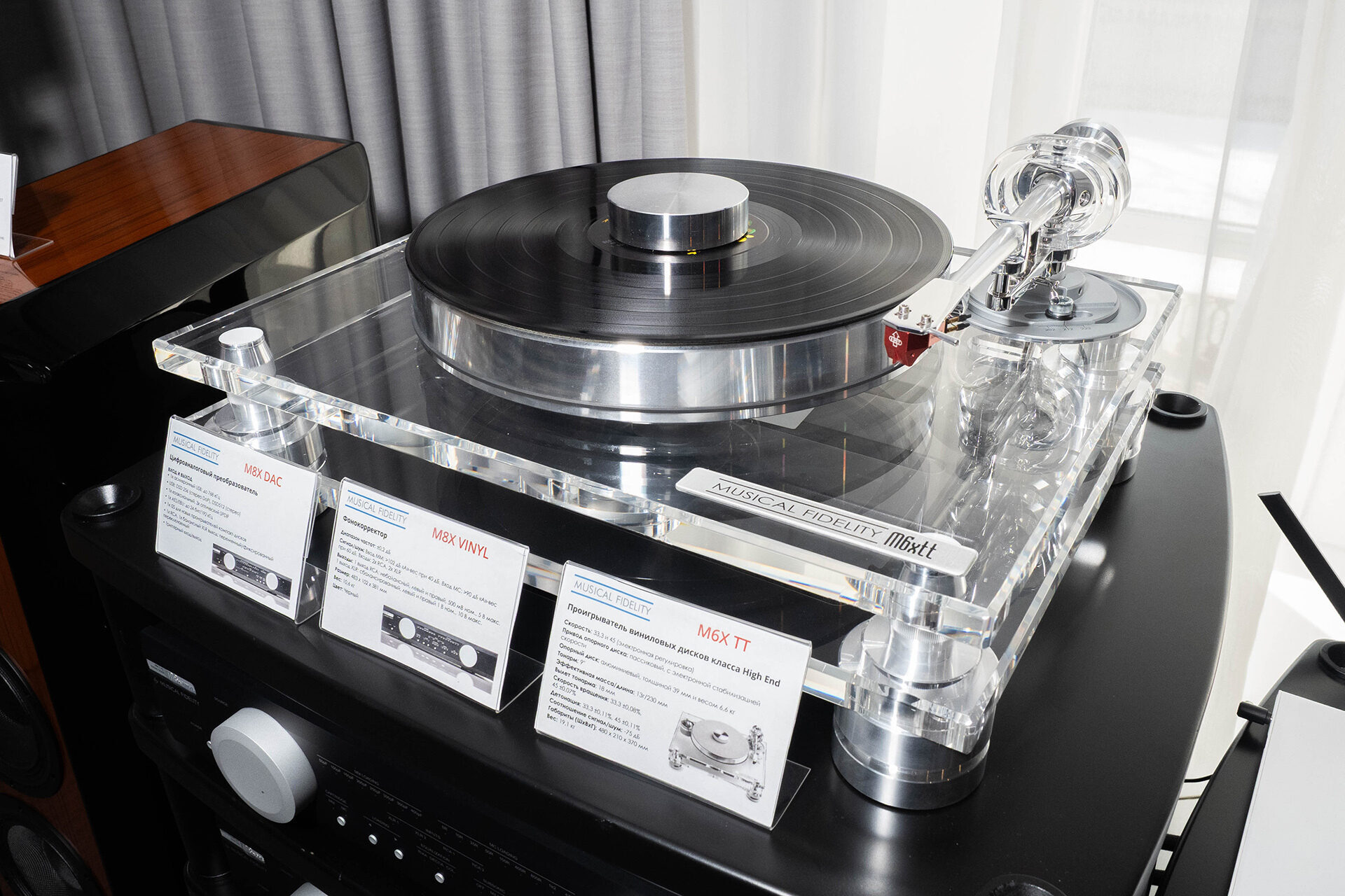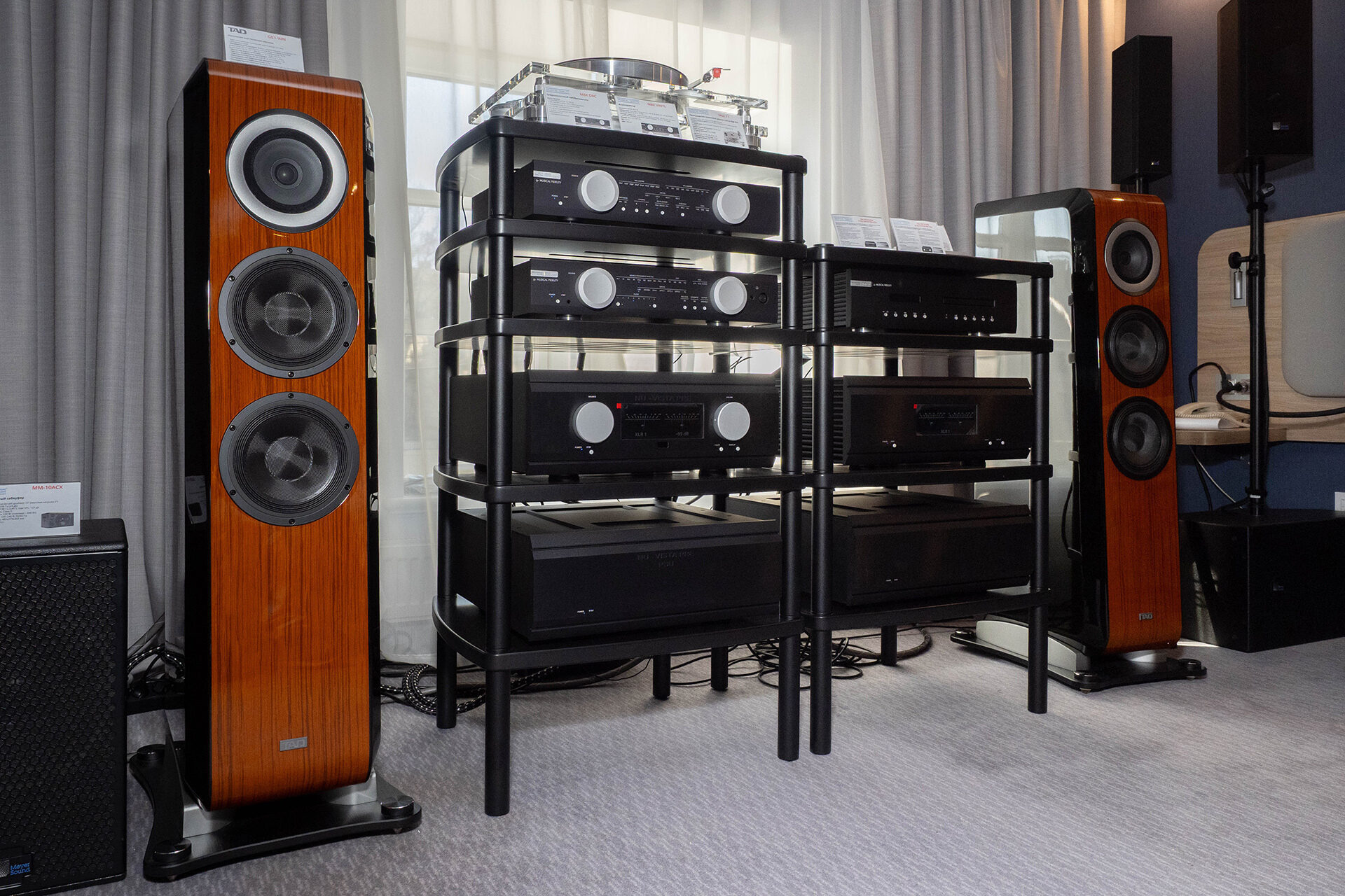 Напольники TAD и полная система техники Musical Fidelity, в том числе с компонентами старшей линейки. Стояли их же проигрыватель винила и фонокорректор.