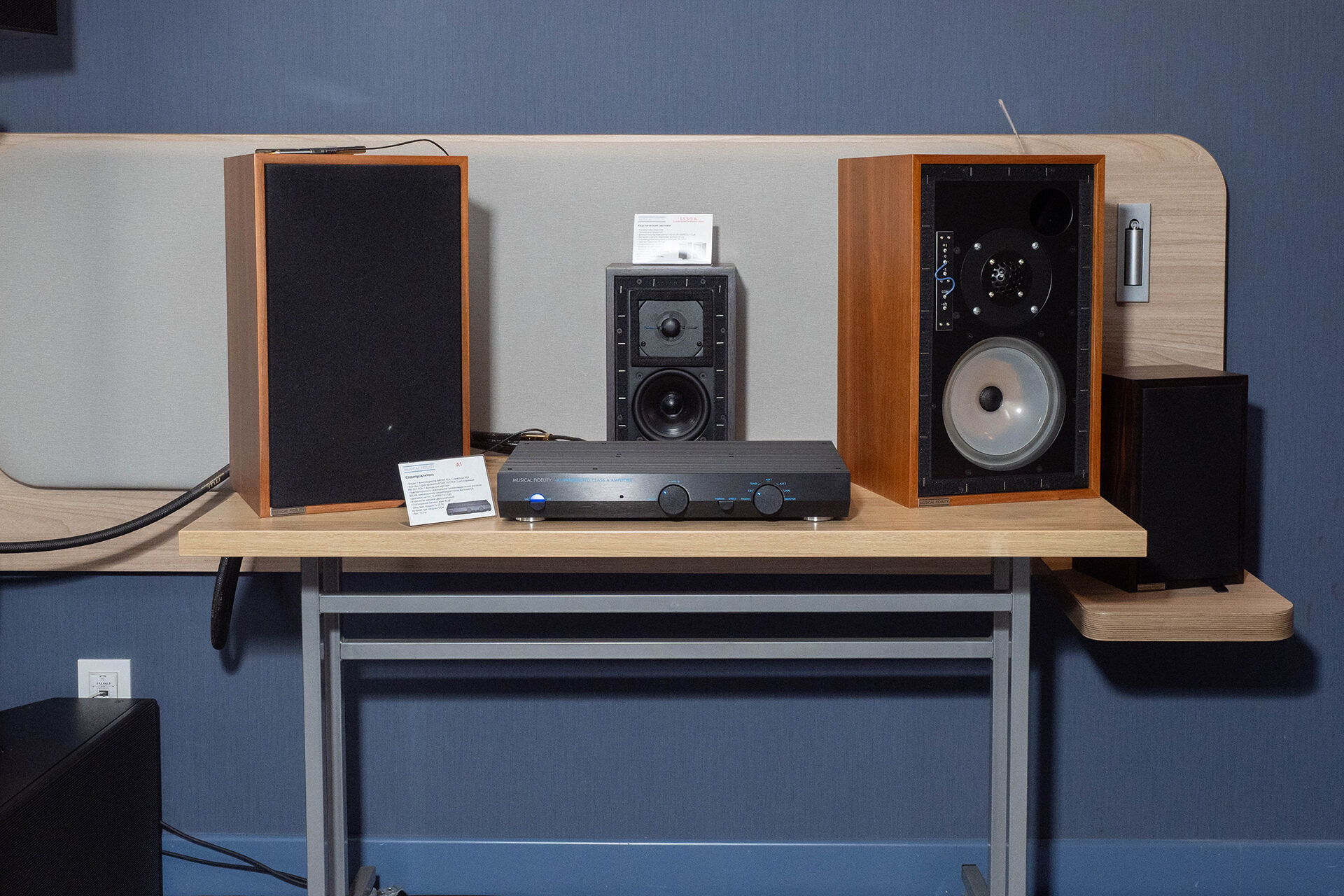 Кроме этого демонстрировалась отдельная камерная система с полочными мониторами Musical Fidelity LS 5/9 и усилителем Musical Fidelity A1. По-своему не менее интересная связка, чем главная система.
