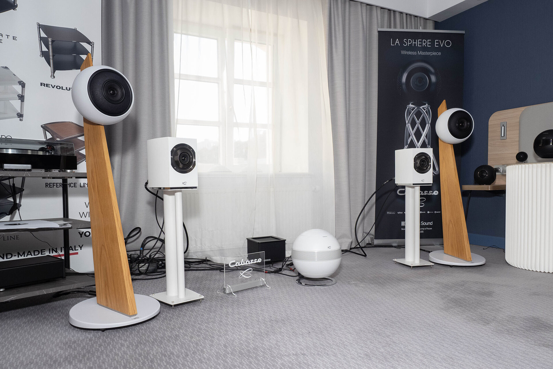 Здесь разные умные активные колонки Cabasse: в виде стереопары или в виде трифоника с сабуфером, в корпусе которого расположено усиление для основной акустики. Эффектный дизайн и звук масштабнее, чем можно было ожидать. Играло интересно, особенно эффектно смотрелись крошечные активные полочники, которые выдавали звук совсем несоразмерно мощнее и масштабнее, чем можно было от них ожидать. Одновременно интересно изучить функционал: пара колонок — это уже полноценная цифровая система с источником и массой возможностей.