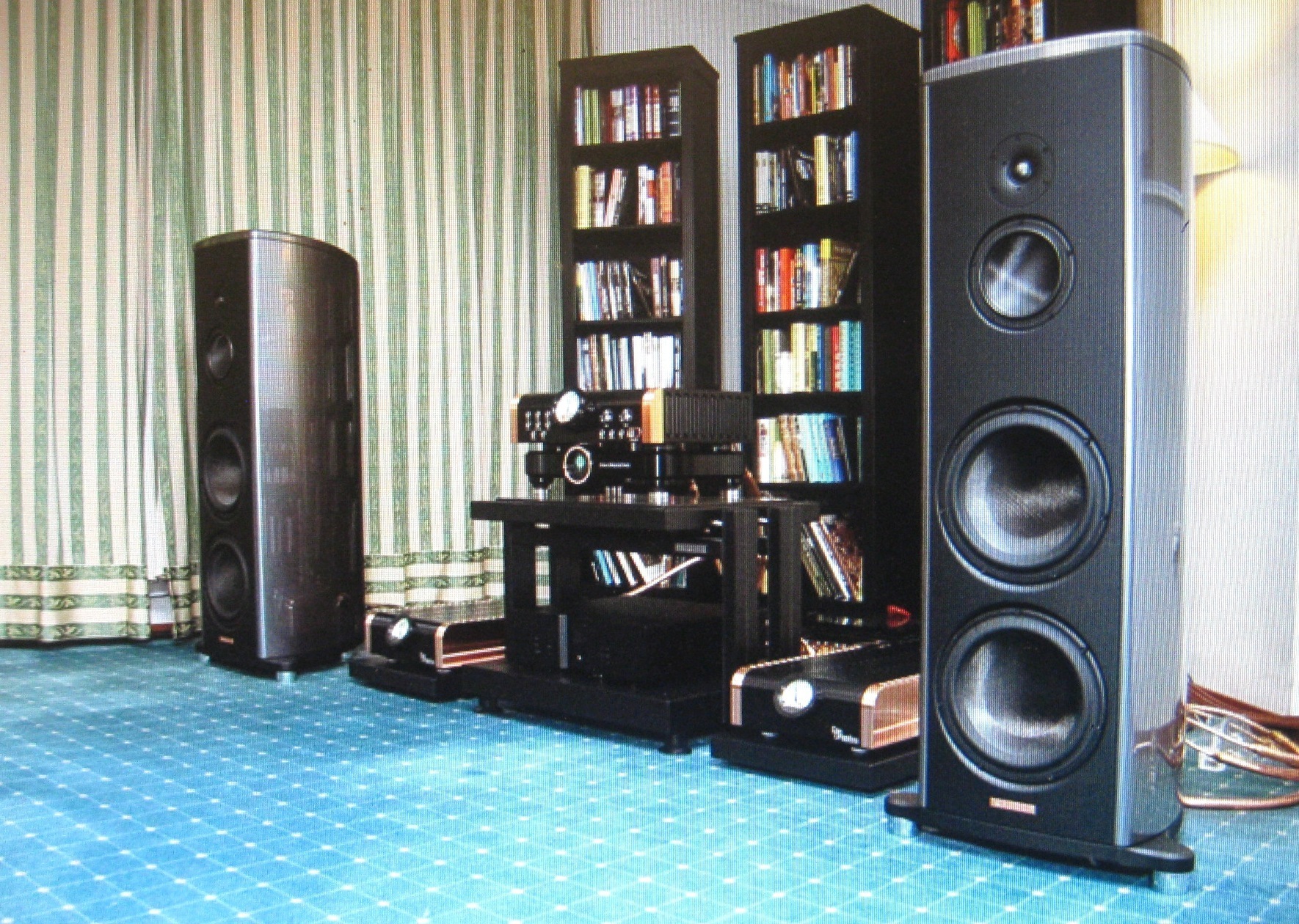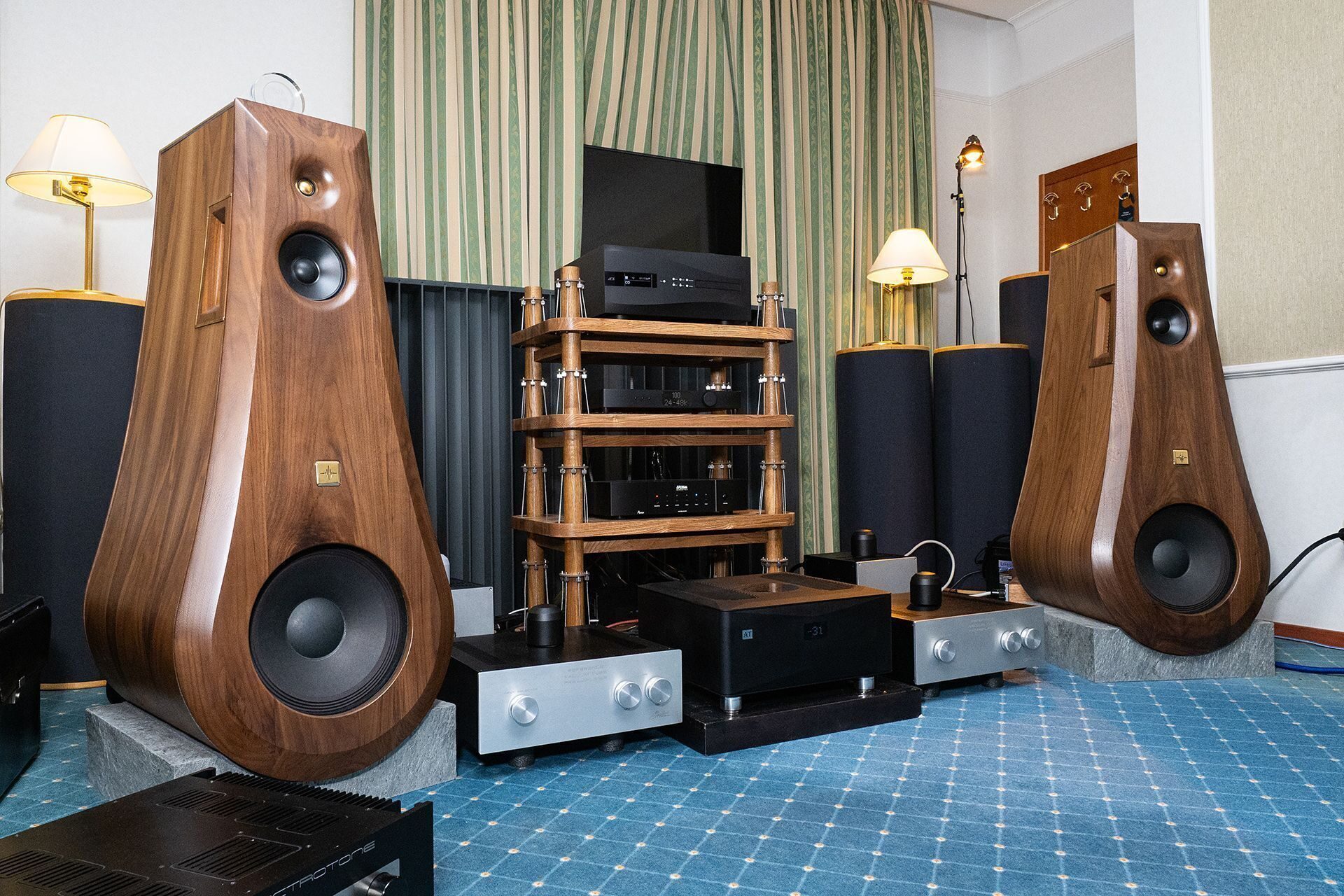 Уникальный техно-пирог от компании Technicalpie обнаружен в комнате 1106. Консультант говорит, что вот конкретно этим колонкам Goebel нужно что-то там добавить, чтобы что-то на каких-то жанрах получить. Простите, подробности упущены — уж больно сочно звучала система с компонентами Gryphon, Cary, Acoustic Signature и HiFi Rose. Колонки будто полностью отлитые из лака, и выглядят так, что слушать хочется только то, что вещают они, минуя надуманные дополнения.
