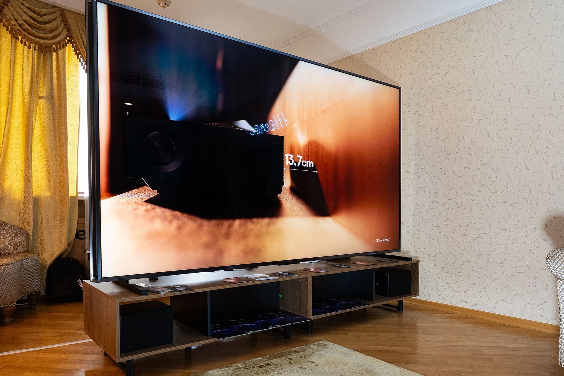 AVIMESTO презентовали всякие визуально-акустические интересности в  комнате 1110. Во главе первой комнаты телевизоры Hisense, и тут сложно решить, что впечатляет больше: внушительная панель Hisense на 110 дюймов или неустрашимая изобретательность ребят из компании, которые нашли какой-то способ доставить это громадину в номер отеля.