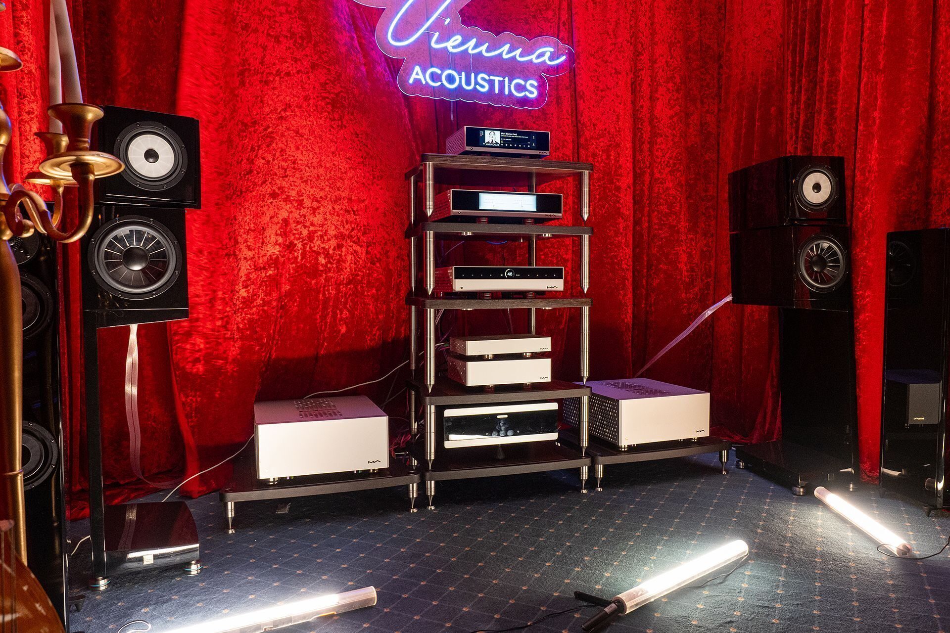 В комнате 1012 топовую модель Vienna Acoustics поставили с комплектом техники от Matrix Audio. Вроде бы налицо идеологический мезальянс, но мы тут все свободны от предрассудков: если играет хорошо, то и ладно. А играло действительно неплохо — быстро, красиво, с ясной серединой, фирменной для Vienna, и с хорошим ощущением мощности, что встречается у Matrix.