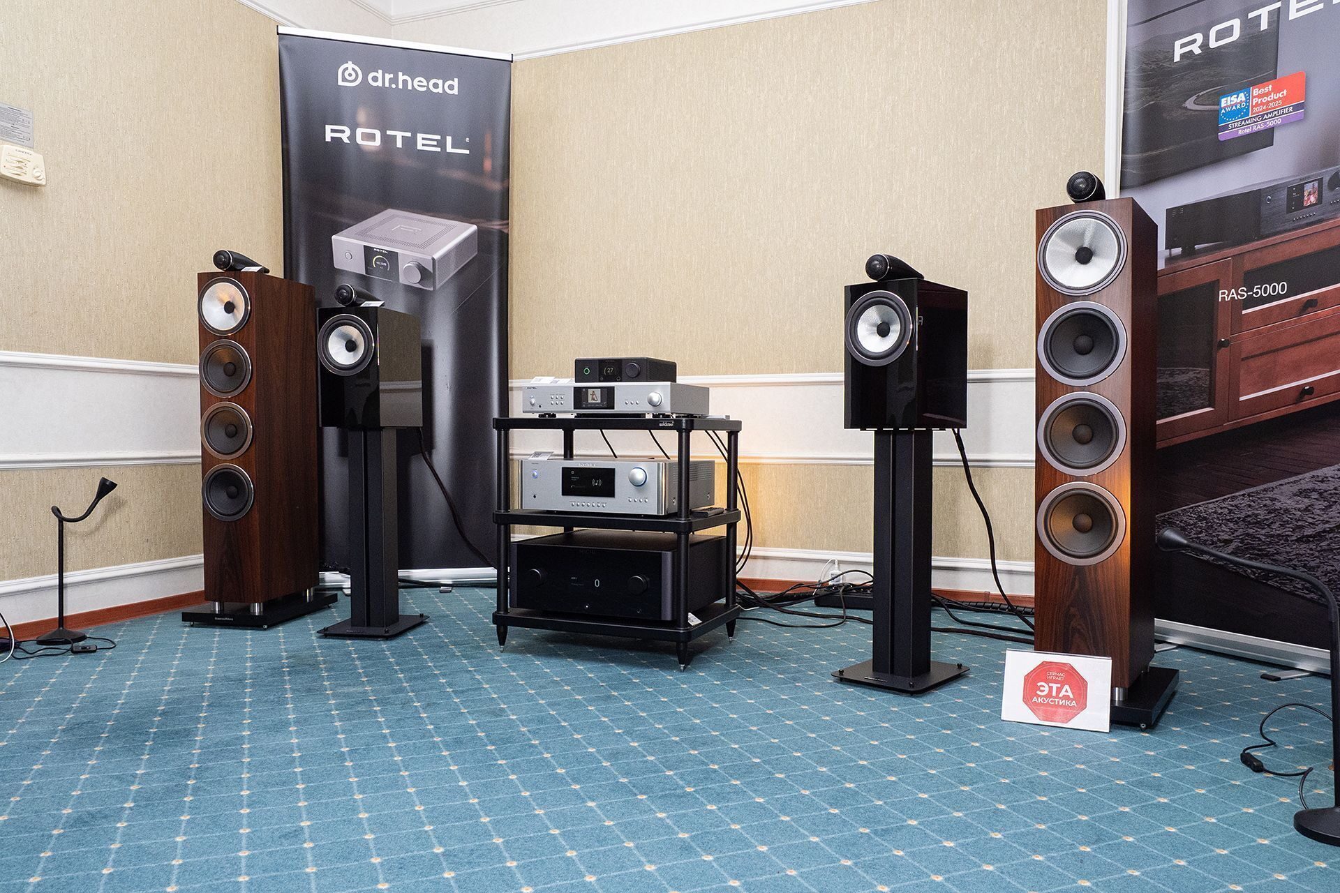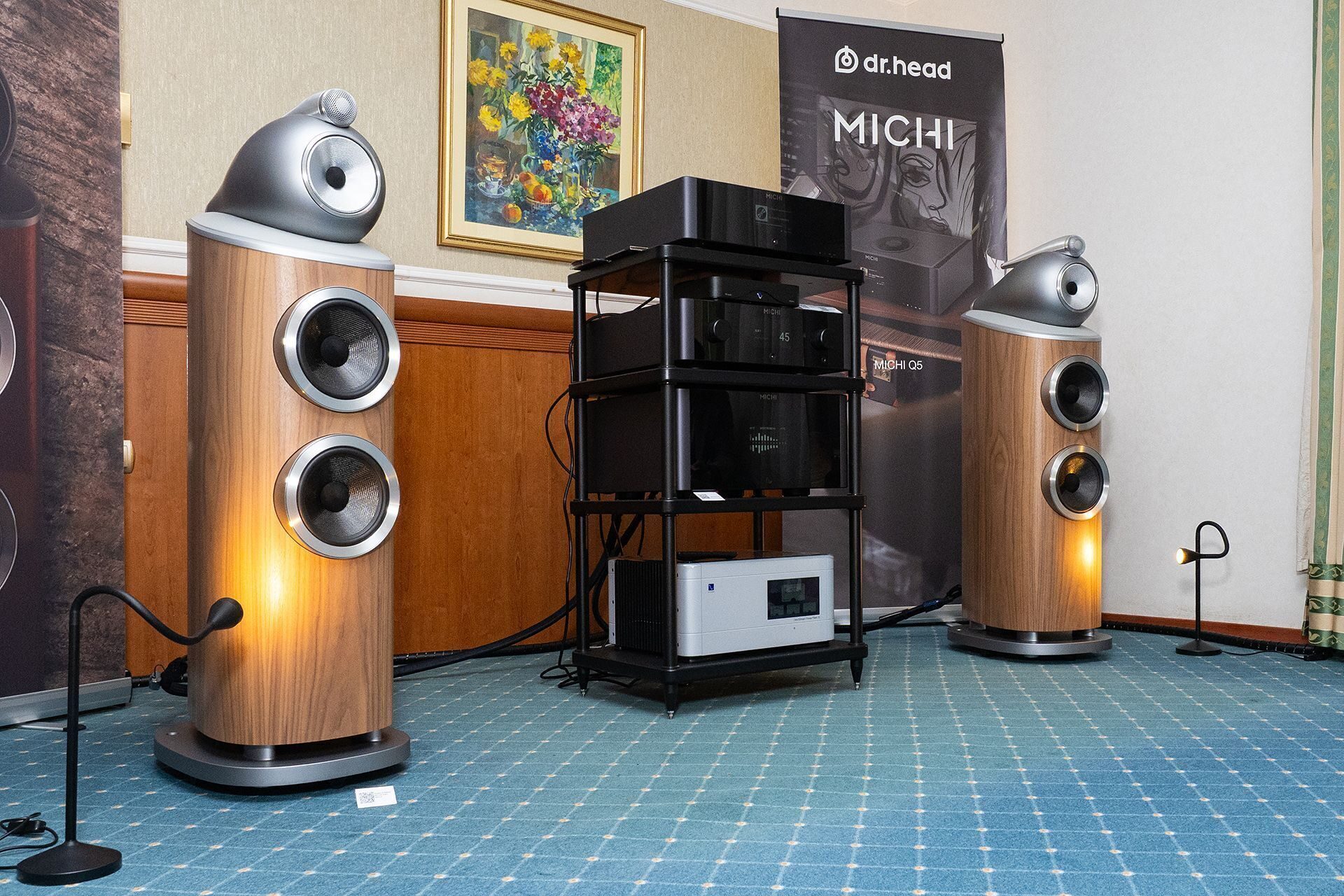 DrHead в комнате 1008 демонстрировал стереосистемы с компонентами Rotel, Michi и Bowers&Wilkins. «Вилкинсы» здесь рангом повыше, да и видом построже — то лак многослойный, то шпон в масле. И явный признак классического подхода — Michi в стойке. Конечно, все это выдает саунд совсем другого коленкора. Две зоны для прослушивания, системы уверенно шагают согласно общепризнанным нормам качества звука, с оглядкой на бережное отношение к ушам слушателей.