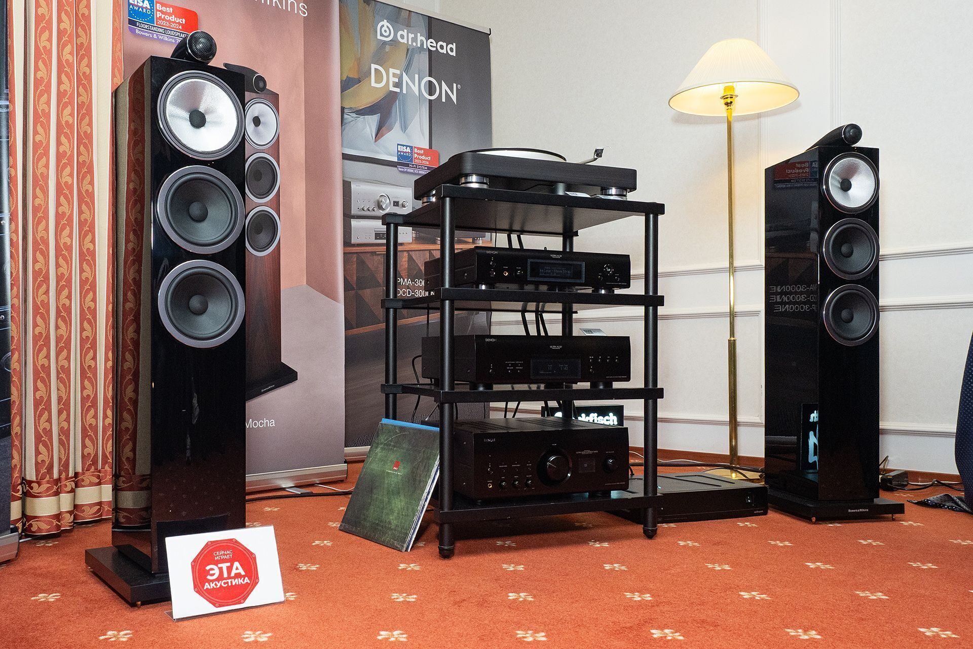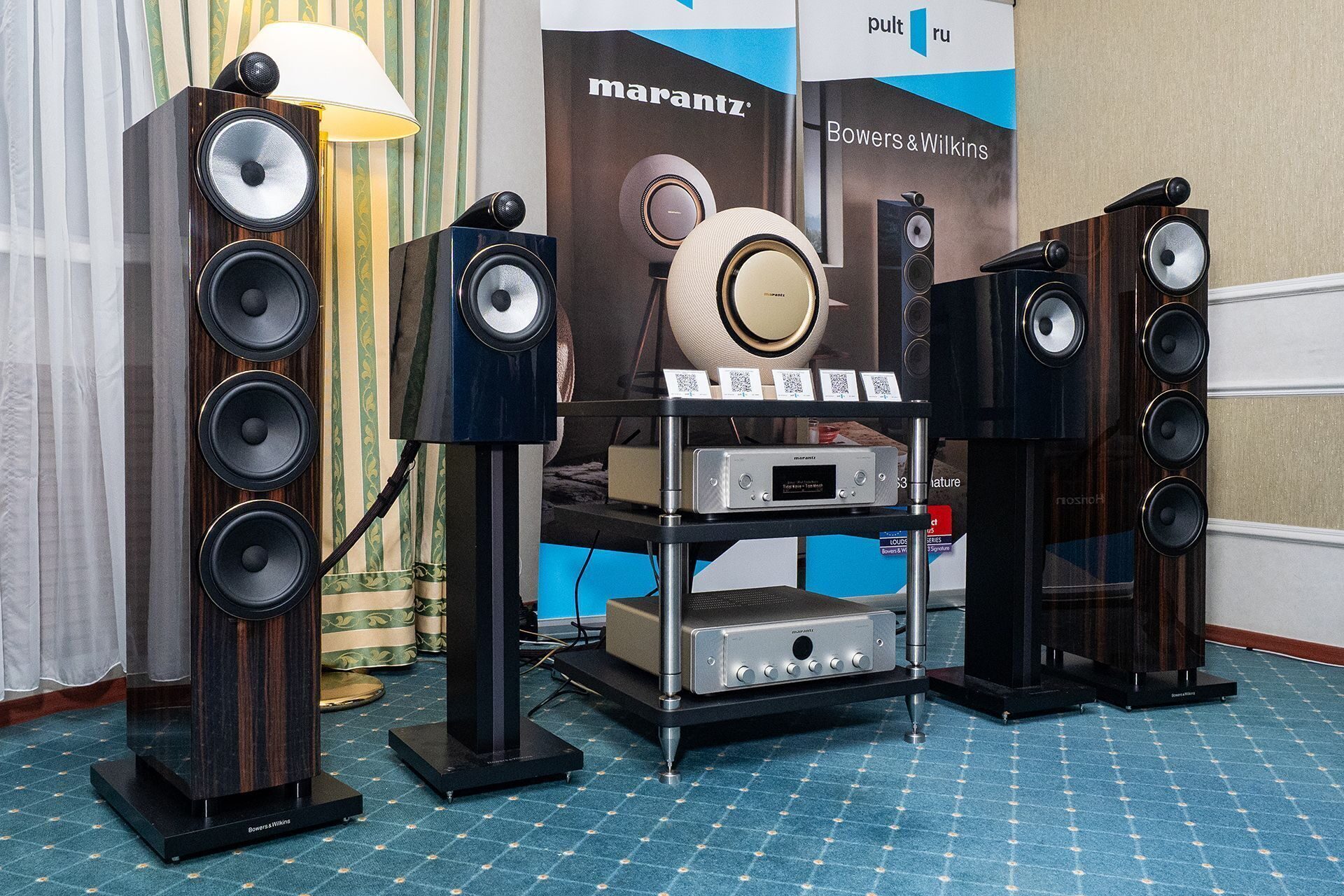 В комнате 1006 компания Pult собрала статистические данные и воплотила их в жизнь с помощью Marantz и Bowers&Wilkins. Аккуратно, но настойчиво звучат «вилкинсы» от самых крошечек до чуть побольше. Ну и на линеечку выше тоже есть — и все это озвучено технологиями японскими, Marantz логотип имеющими. Огромный японский ресивер Marantz на отдельном столе обещает внушительные впечатления от кино, но только потом, когда купите. А хитом комнаты стала осязаемо-воздушная лайфстайл икона — Marantz Horizon, с подсветкой нежной и звуком вкусным. Собирались только посмотреть, но в итоге все равно послушали.