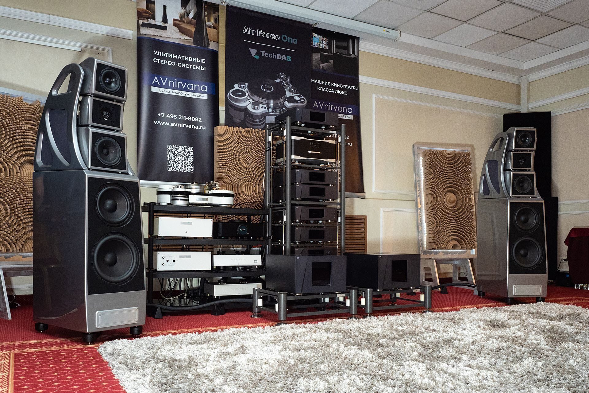 А в Зал Тучков завезли очень серьезную систему, построенную общими усилиями нескольких участников. Акустика Wilson Audio Alexx V, усиление и фонокорректор — десятая серия CH Precision, их же цифровой источник, причем тоже из этой серии, в паре с комбайном Wadax, а в качестве аналогового источника — проигрыватель TechDAS Airforce One Premium с родным тонармом. Очень взрослый уровень системы, слушать крайне рекомендуется. Да и просто посмотреть, как все это работает. Отстройка одних «вилсонов» заняла немало времени, но результат однозначно того стоил.