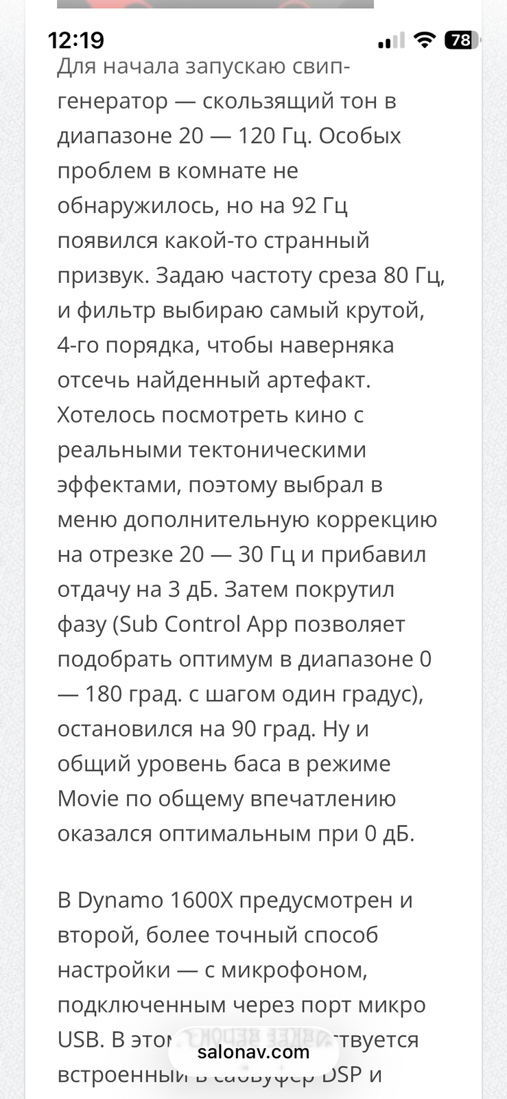 Изначально подключил его совместно с предыдущей своей акустикой Dynavoice Definition DF-8 по высокому уровню кабелем QED XT25 Pre-Term Speaker Cable. Звук разочаровал. В голове сразу возникли мысли, сколько потеряю при скорой продаже. Затем сразу переподключил с Martin Logan Motion 60 xti: вот это уже совсем другое дело, будто бы их делали друг для друга! Бас быстрый, плотный, не локализующийся в месте расположения саба, общая масштабность звука теперь просто на высоте. Убедился теперь на собственном опыте, что такое 15" в домашнем стерео. Теперь, правда, приходится иногда регулировать громкость саба через приложение, на электронной басовитой музыке обычно немного убавляю. Сравнил звучание саба на шипах и без них, разницы особой не заметил. Далее установил приложение ARC Mobile (заработало почему-то только с третьего раза, возможно проблема в моих не самых опытных руках), настроил через микрофон телефона, включил: также особой разницы с ним не услышал. Попробовал подключить по RCA, звучание на мой слух понравилось меньше.