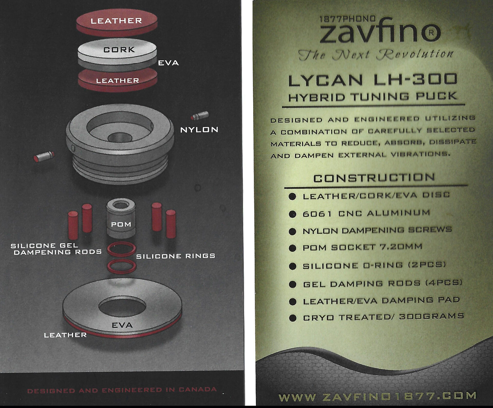 Новый прижим для пластинок компании Zavfino - модель Lycan LH-300 имеет сложную конструкцию из алюминия прошедшего криогенную обработку, пробки, кожи и гелевых вставок. Масса устройства - 300 грамм.