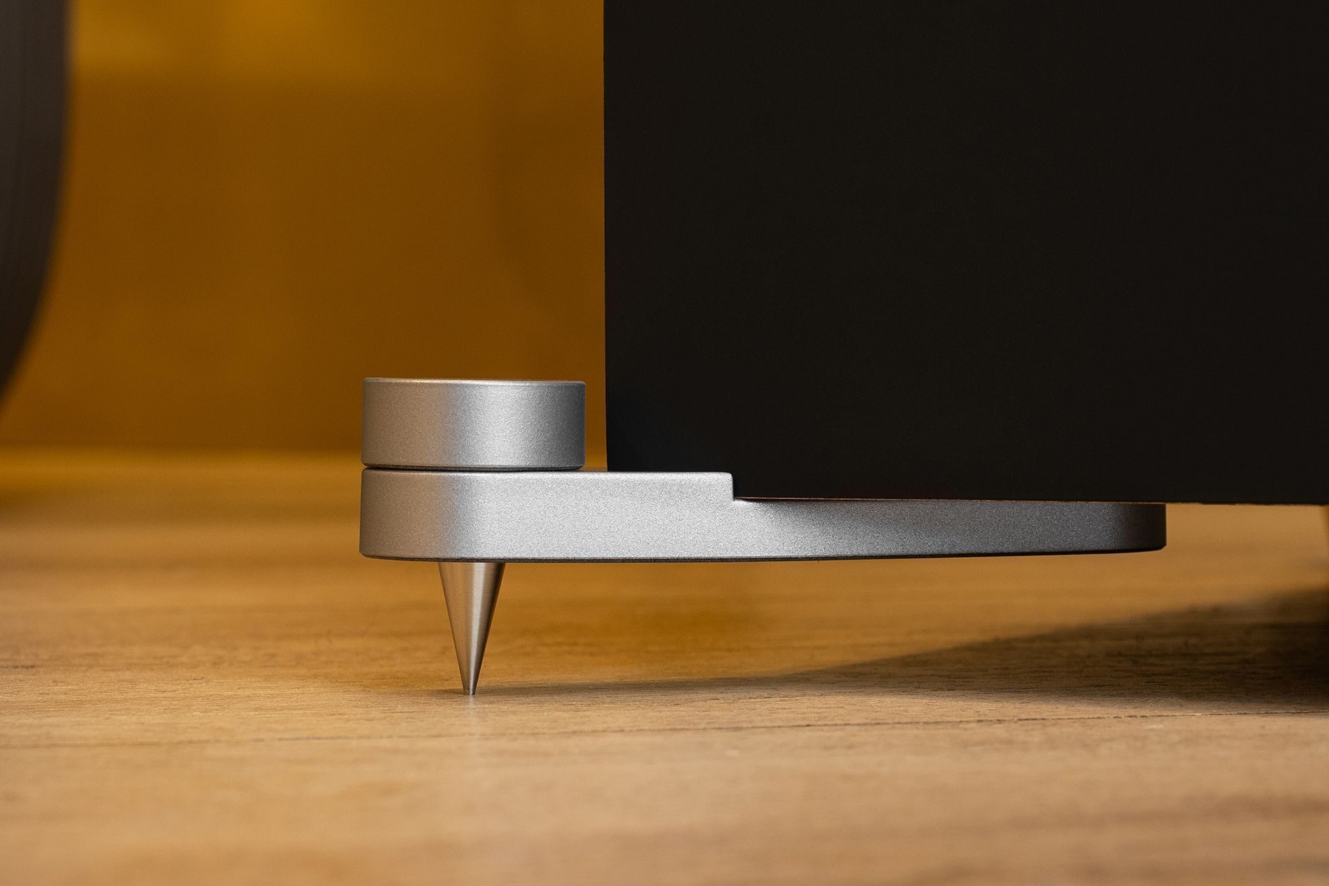 Для минимизации вибраций помимо перегородки, разделяющей корпус, внутри есть еще несколько усиливающих элементов, повышающих общую жесткость конструкции. Для виброразвязки с полом в комплект поставки входят шипы с металлическими подставками. Вынос опор акустики за пределы корпуса — это не столько вопрос эстетики, сколько способ повысить устойчивость достаточно высоких и узких колонок. Хотя, надо признать, смотрится красиво.