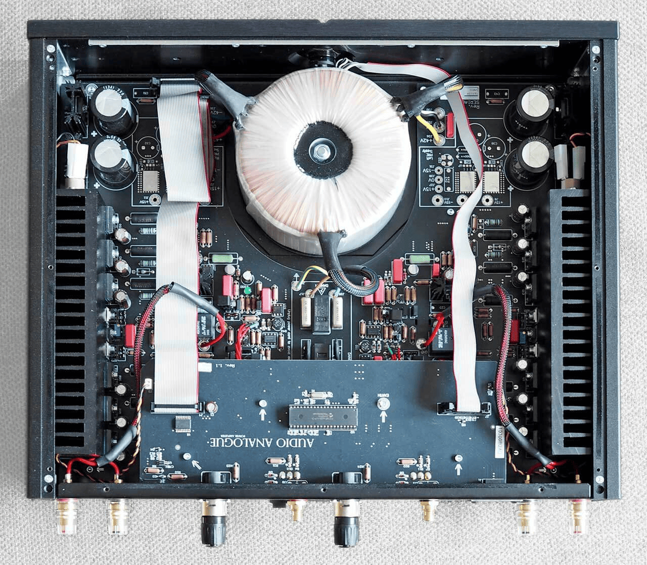 Audio Analogue AA100DM — это усилитель мощности класса AB с укороченными сигнальными трактами и полностью симметричной архитектурой. Такой подход служит минимизации внешних помех, а схема dual mono обеспечивает высокое разделение каналов — по крайней мере начиная с массивного тороидального трансформатора мощностью 760 ВА, питающего оба канала. Усиление сигнала в каждом канале обеспечивают шесть биполярных выходных транзисторов, передающих сигнал непосредственно на акустические терминалы.