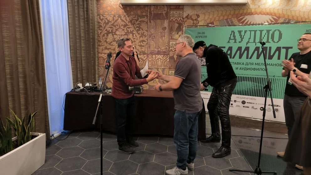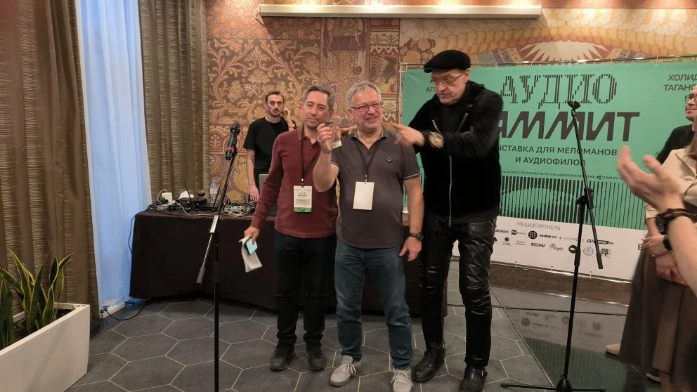 Организаторы выставки. Ребята, огромный респект вам!!!Вот это кент слева - Дима Мороз:))Серёга, извини. Телега у меня не работает, так что лови здесь:))Леонид получает награду от ДАСтерео за звук УралаКрасивые. Динамики шикарные. А звук... Ну не стоит их звук таких денег:))Павел Кучменко(Пашкины Shortы) и его верная жена Оксана таки смогли послушать винил Паши на нашей системе.Посмотрел. Послушал. В одиночестве... И понял что кино в многоканале меня уже не так трогает как десять лет назад... Старею наверно...