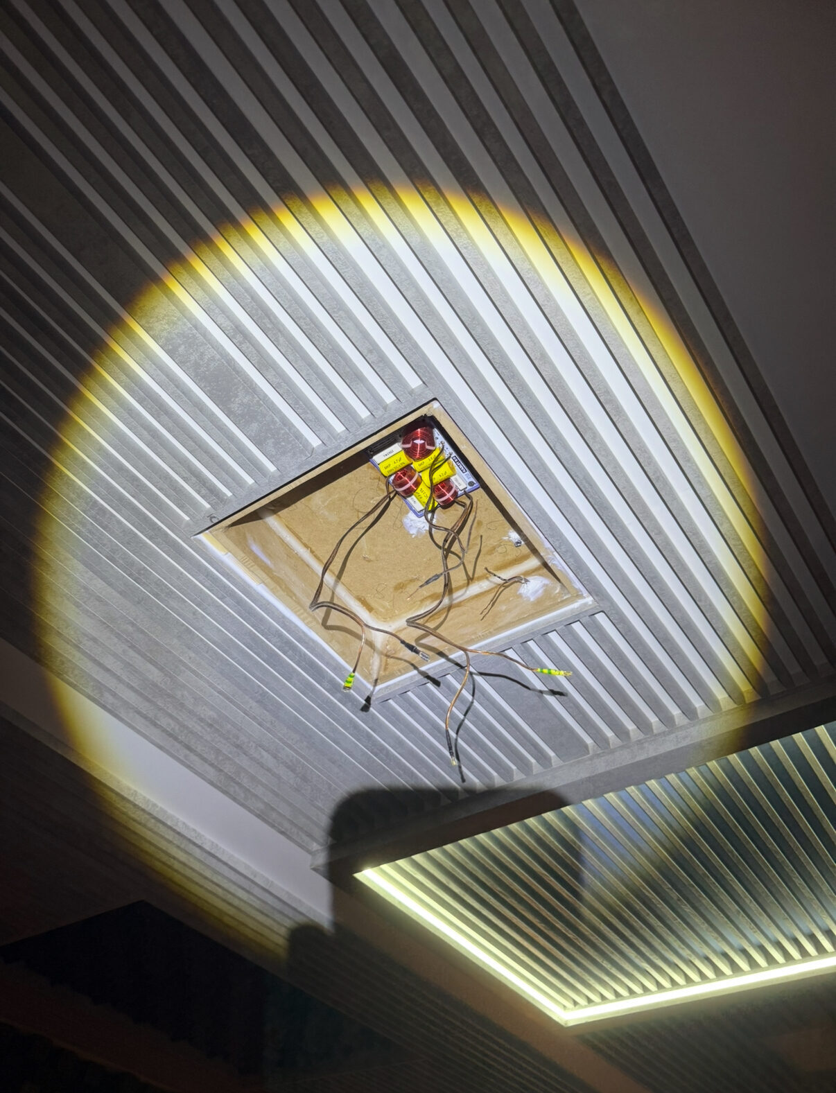В потолок были интегрированы корпуса из мдф, обьемом 7,5 литров.