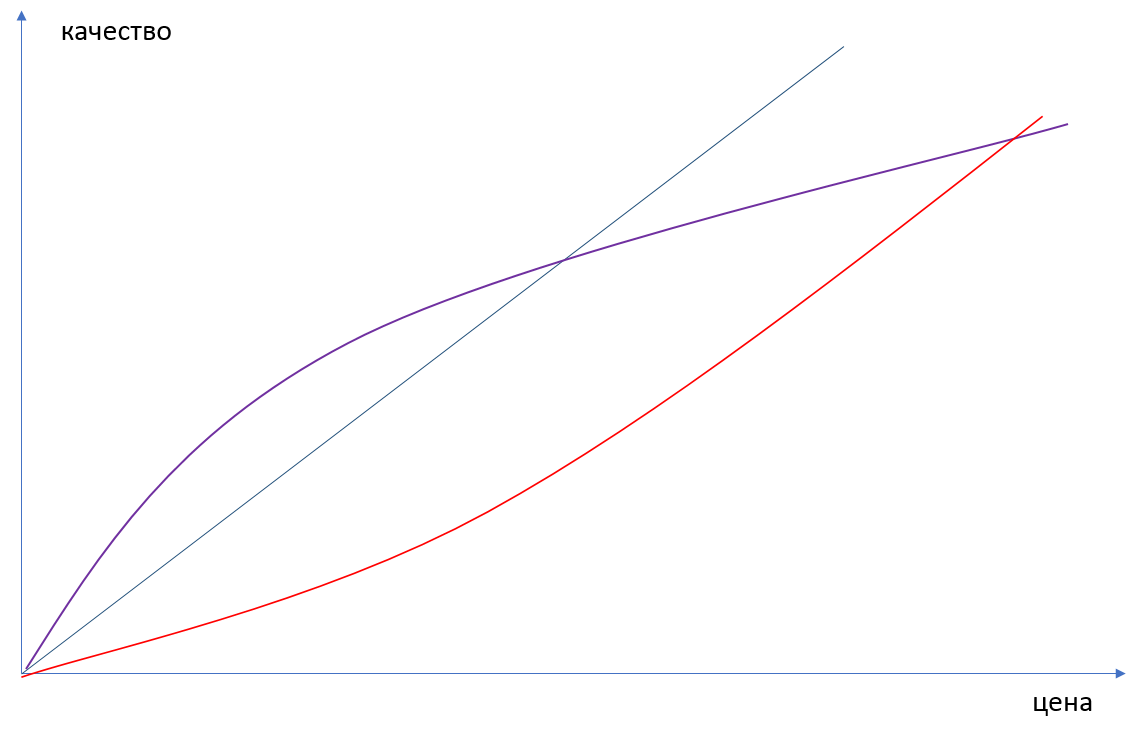 График скорее тот, который черный. Чем выше качество приближается к техническому пределу, тем все меньшие улучшения достигаются все большей ценой.
