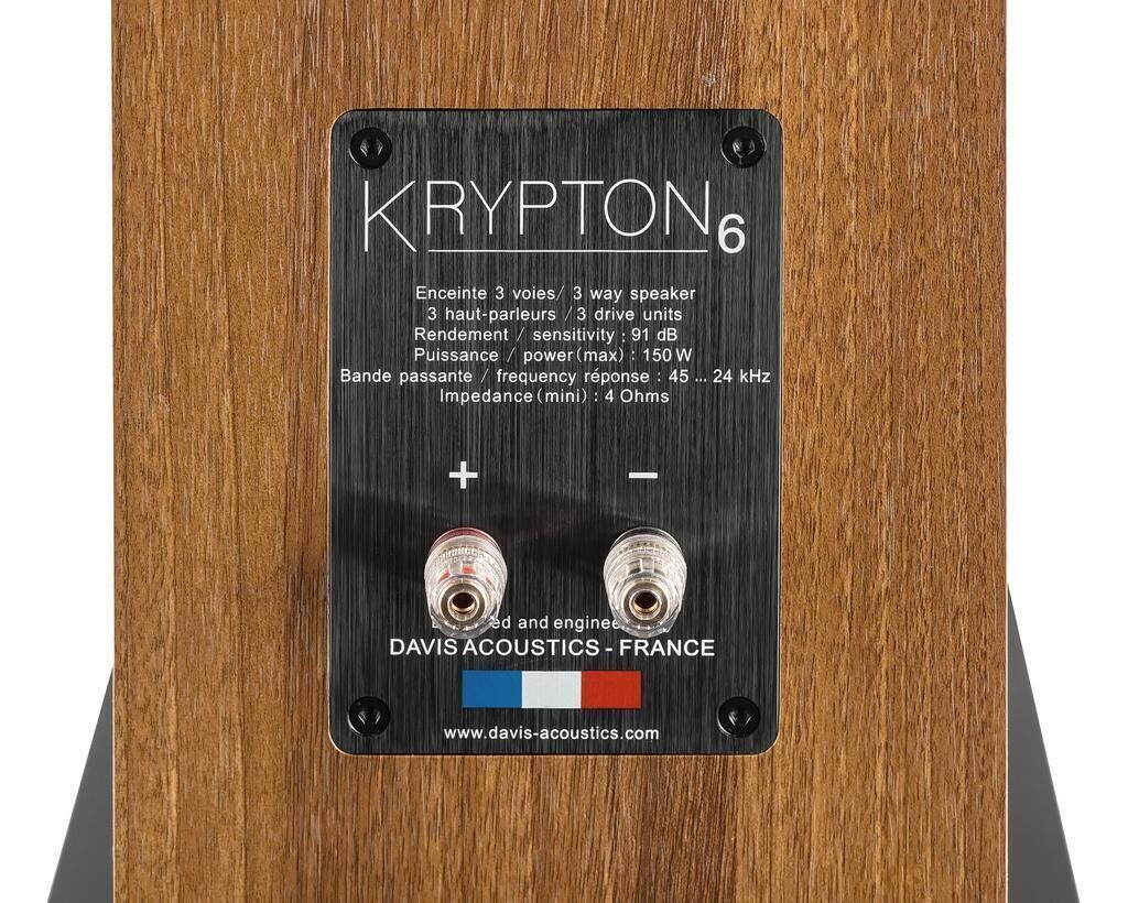 Davis Acoustics Krypton 6 — трёхполосные напольные колонки с фронтальным ламинарным фазоинвертором. Все динамики — собственной разработки компании. Бас воспроизводит 13-сантиметровый драйвер с диффузором из усиленной целлюлозы, середину — динамик того же размера с арамидной диафрагмой и фиксированным фазовыравнивающим телом, а высокие частоты — 28-мм тканевый купол. Корпуса из MDF усилены внутренними распорками, басовый отсек демпфирован синтетической ватой. Частоты раздела — 400 и 4000 Гц, заявленный диапазон — от 45 Гц до 24 кГц, чувствительность — 91 дБ.