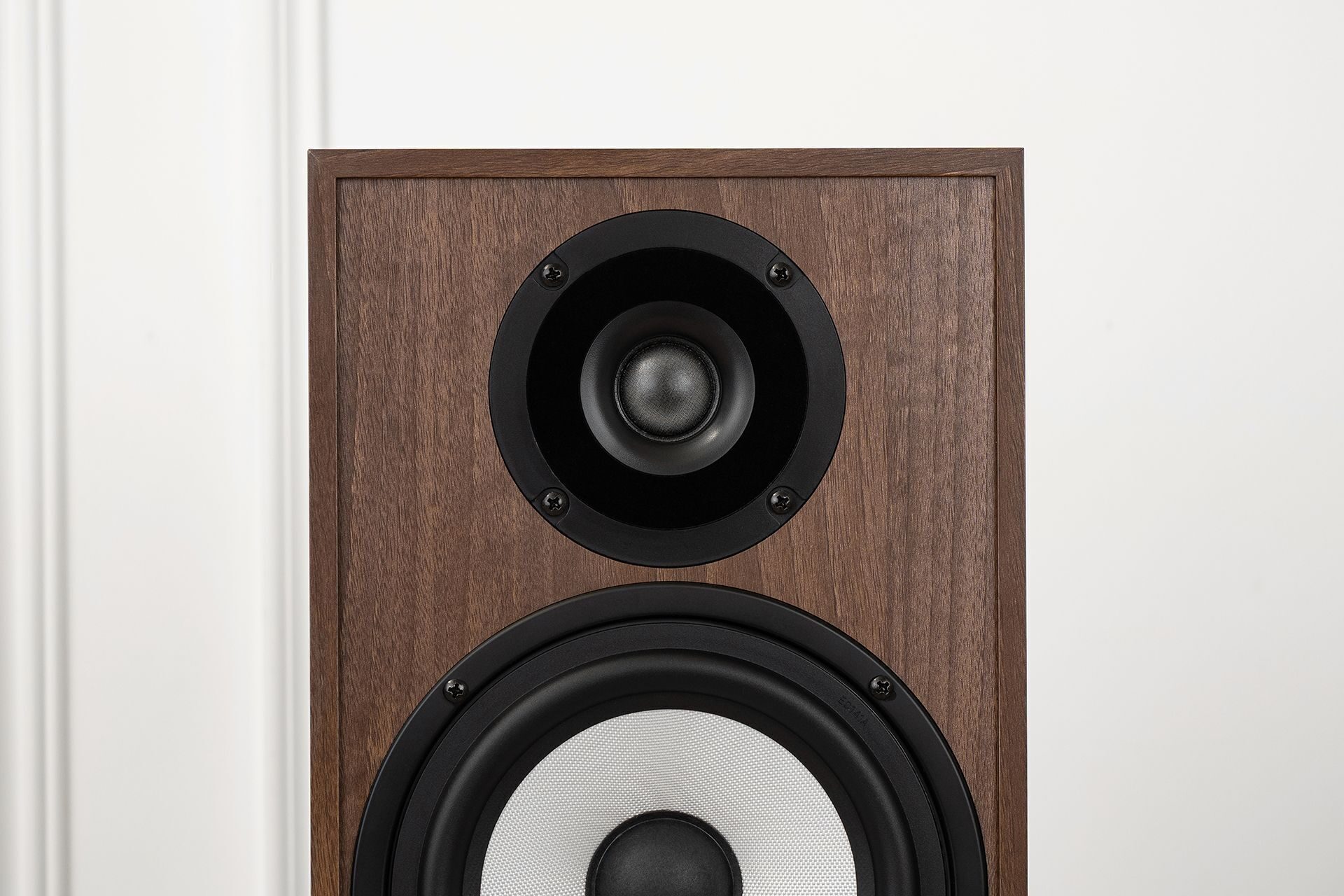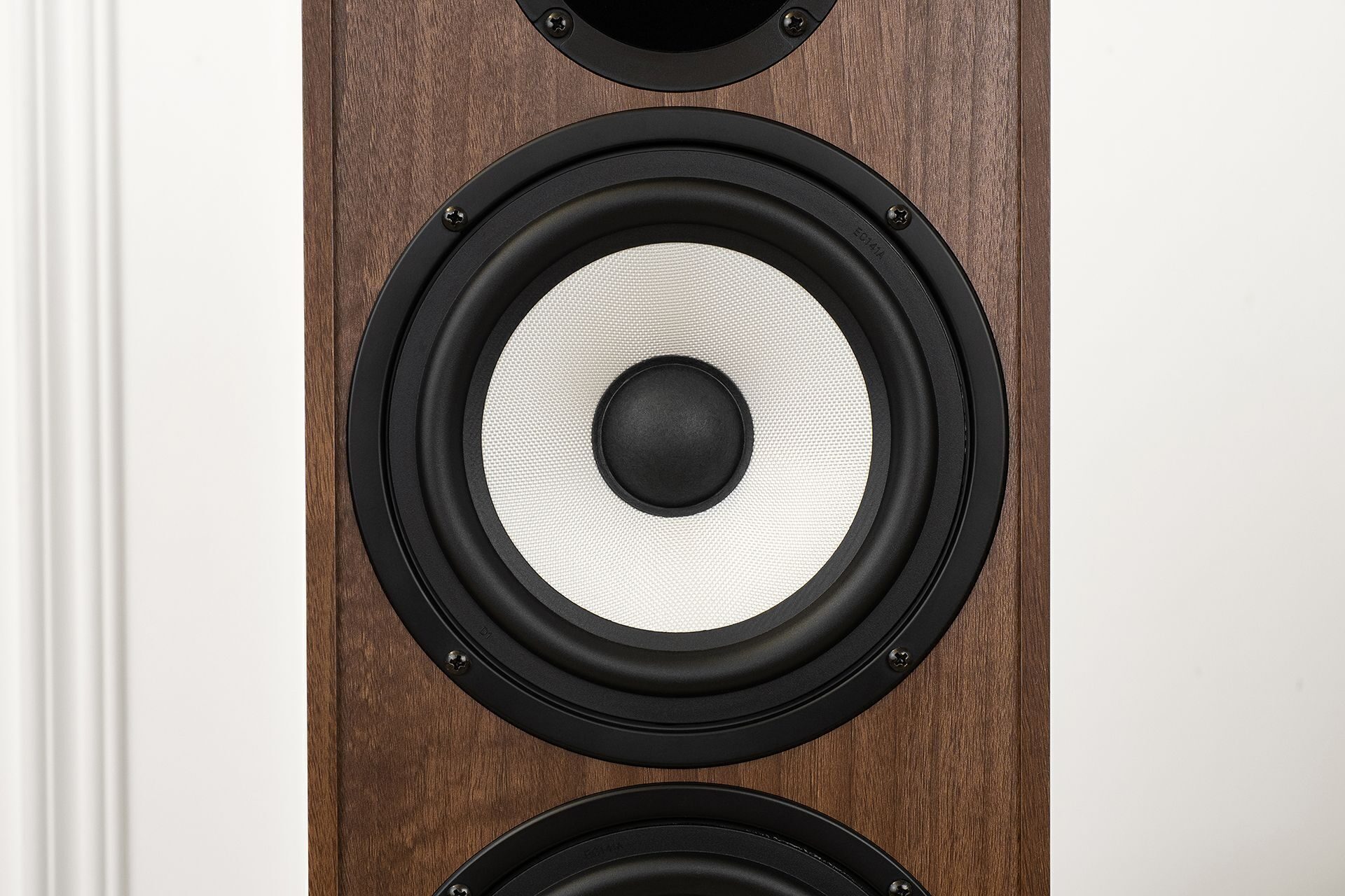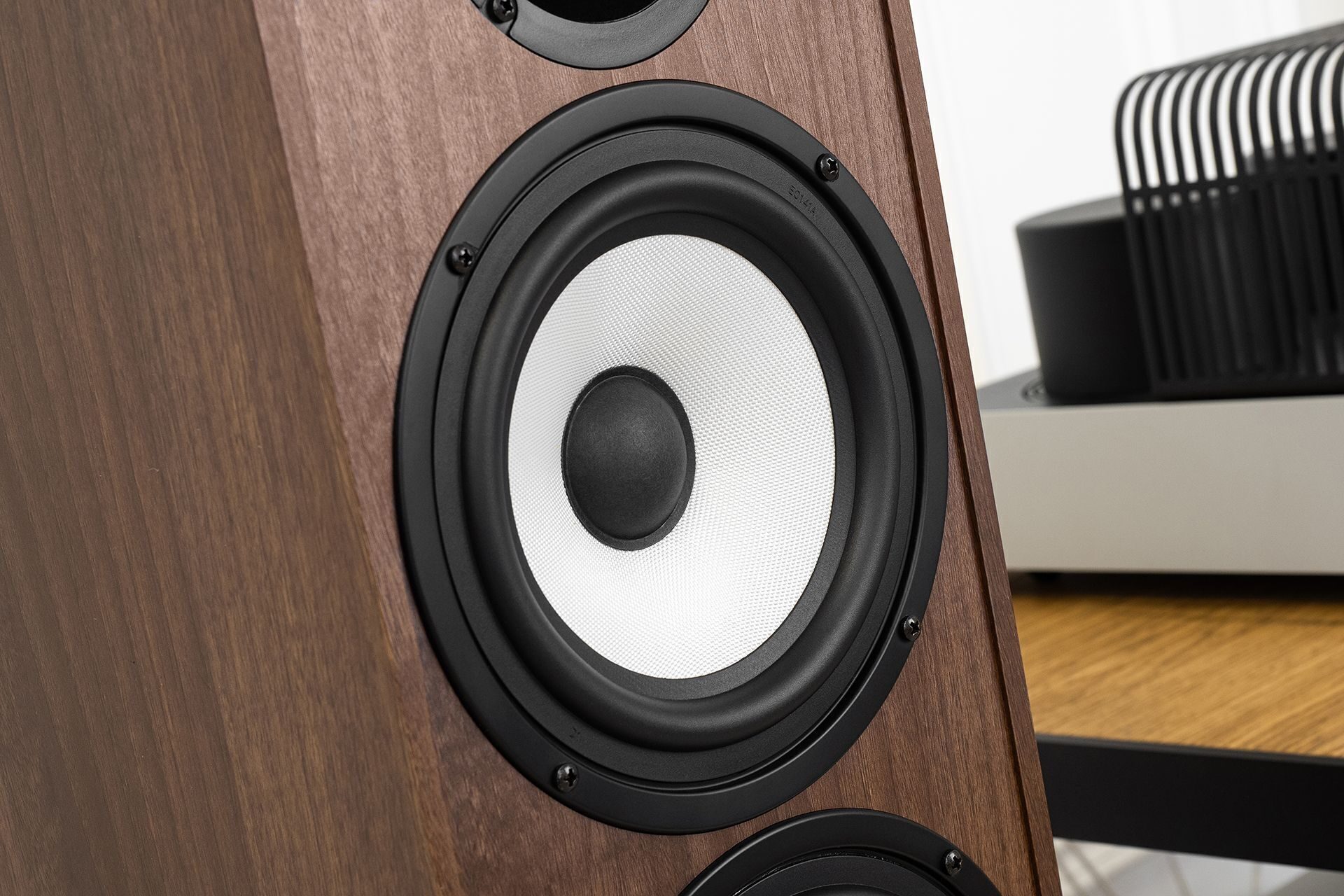 Динамик для средних частот и пара басовиков выглядят абсолютно одинаково. Если задуматься, то такое решение имеет право на жизнь: у всех полочников басовик озвучивает средние частоты — и ничего, как-то живем, слушаем. Но в этом случае главный инженер одним росчерком пера внес в динамик для средних частот коррективы.