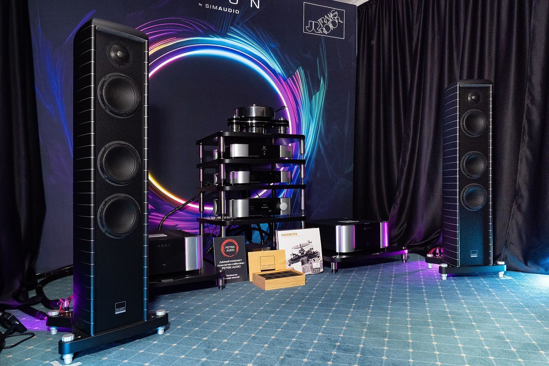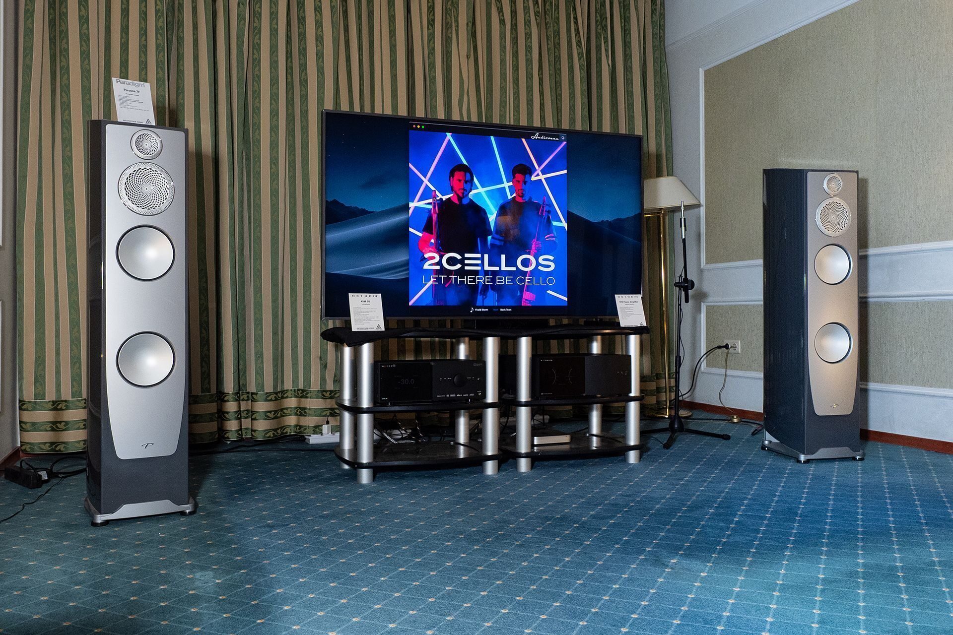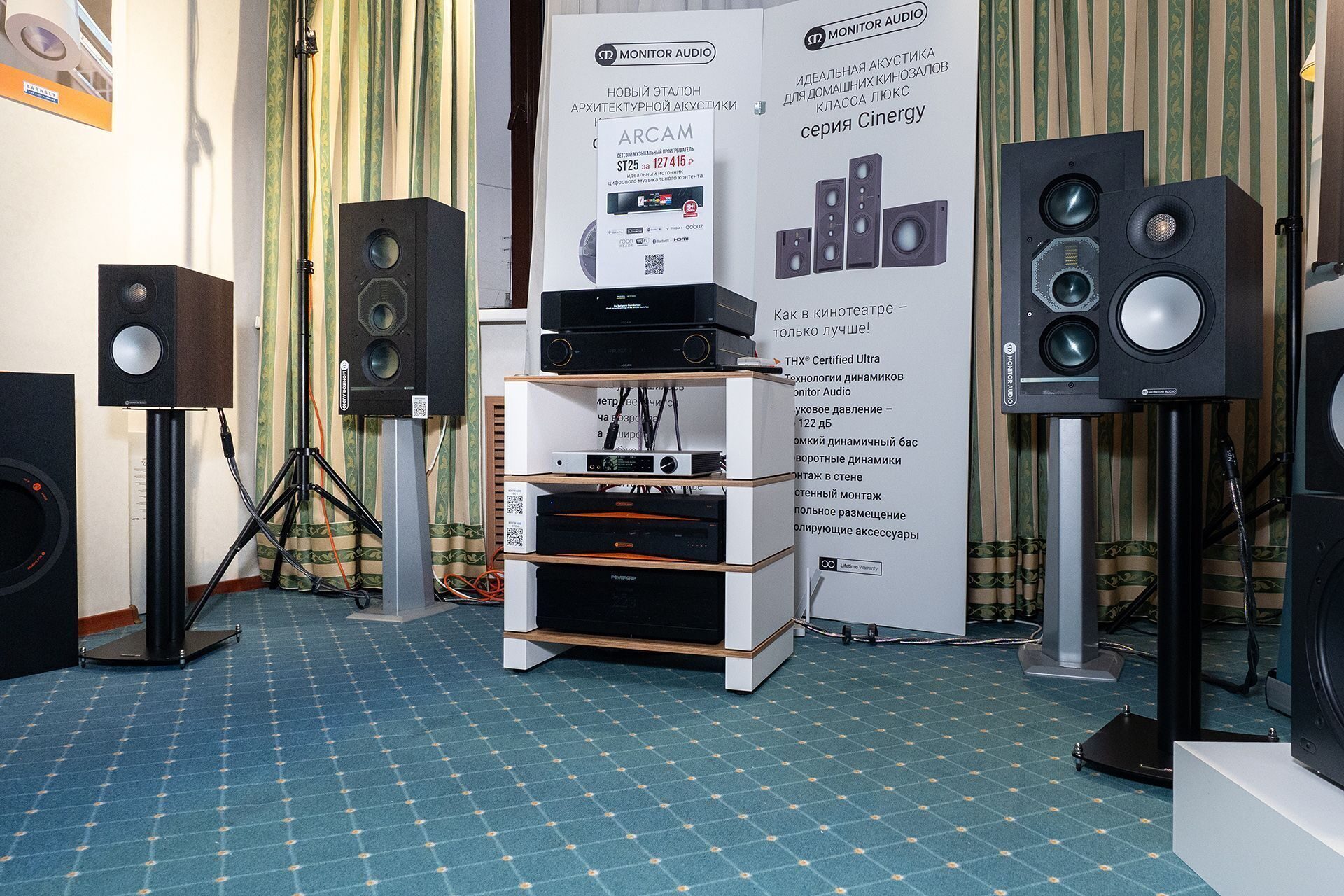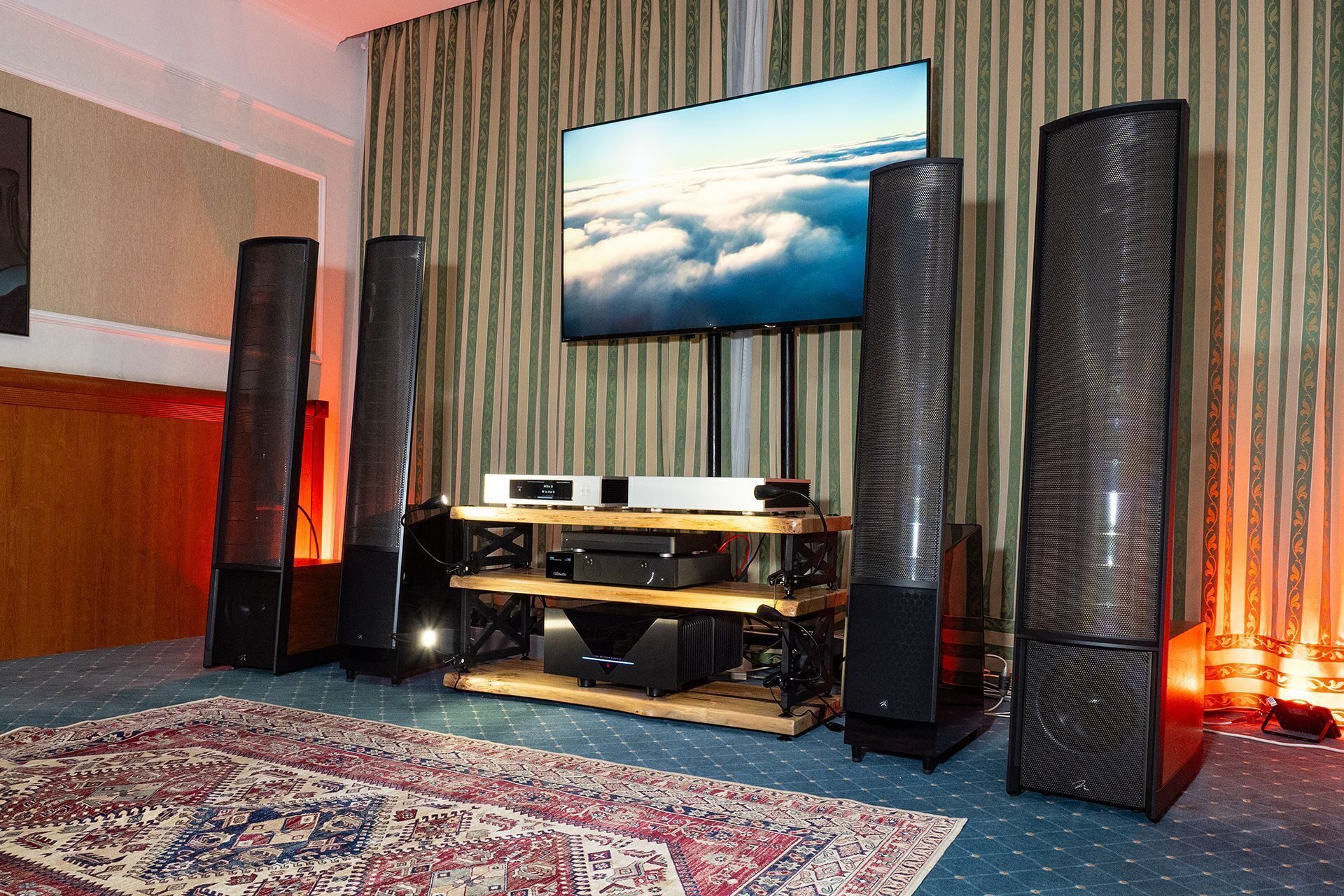 Любителям домашних кинотеатров тоже есть, что посмотреть на выставке. В комнате 605 расположилась, пожалуй, самая серьезная система с многоканальным звуком и проекцией. Звуковое окружение в ней создает Atmos-процессор Trinnov Altitude 16, усиление возложено на усилитель JBL Synthesis, а, собственно, акустику в зале создают системы MK Sound.