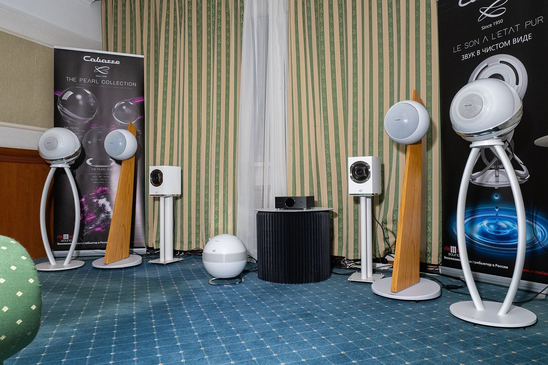 В комнате 505 та же Armada Sound демонстрировала совершенно другую идеологию звучания: там главенствовала умная активная акустика Cabasse. Причем колонки не просто поштучно красиво стояли, а из них фактически выстроили целую экосистему, которая и выглядит, и звучит узнаваемо. Да и эффектно тоже.