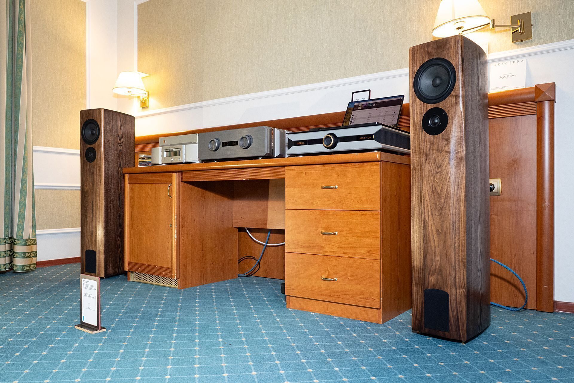 Еще один новый участник на выставке — «Лабиринты Звука» в комнате 701. Необычного вида акустика с интересной отделкой, да и конструктивно сложная. Сборная солянка по электронике. Но надо сказать, что звук получился совсем не вычурный и достаточно интересный. Да, внешний вид вызывает очень сложные чувства, а вот если слушать, то впечатления другие. Необычное сочетание.