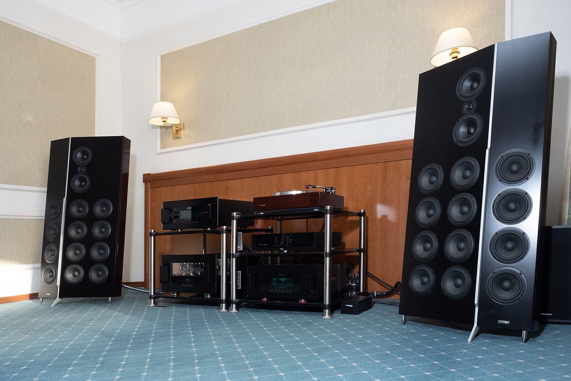 А следом, в 705 комнате, показывают уже электростаты MartinLogan. Не самые крупные, но все равно достаточные для того, чтобы оценить идею и подход компании к звуку. Если учесть, что за счет использования ленточного твитера разработчики хотят приблизить звучание корпусной акустики к электростатической, то многое становится понятно.
