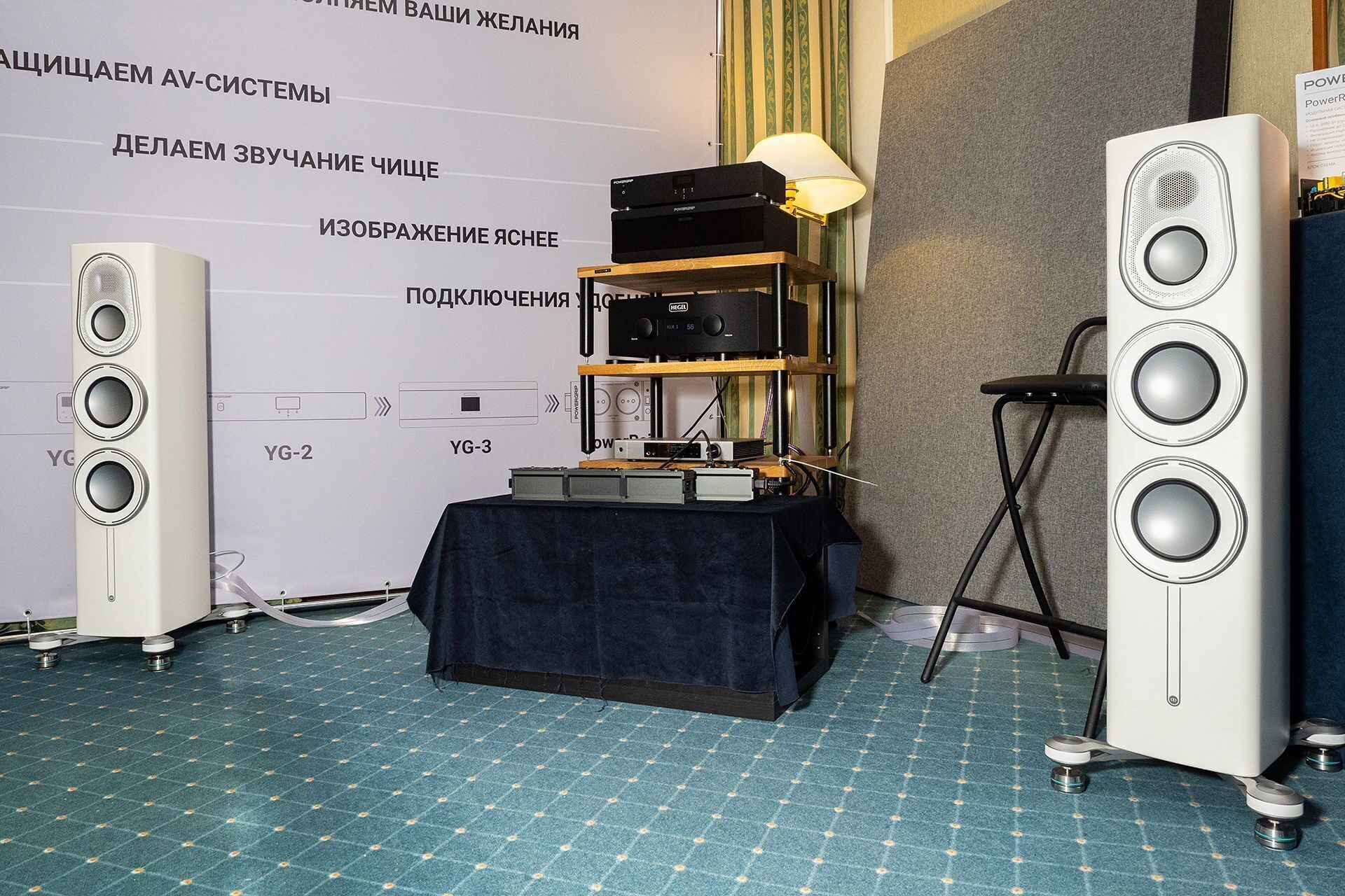 В комнате 702 собрана несложная лаконичная система с Monitor Audio и Hegel, но главное, что здесь показывают — сетевые фильтры Powergrip, в том числе новую модульную систему Powergrip PowerRail, позволяющую набрать сетевой разветвитель из отдельных модулей.