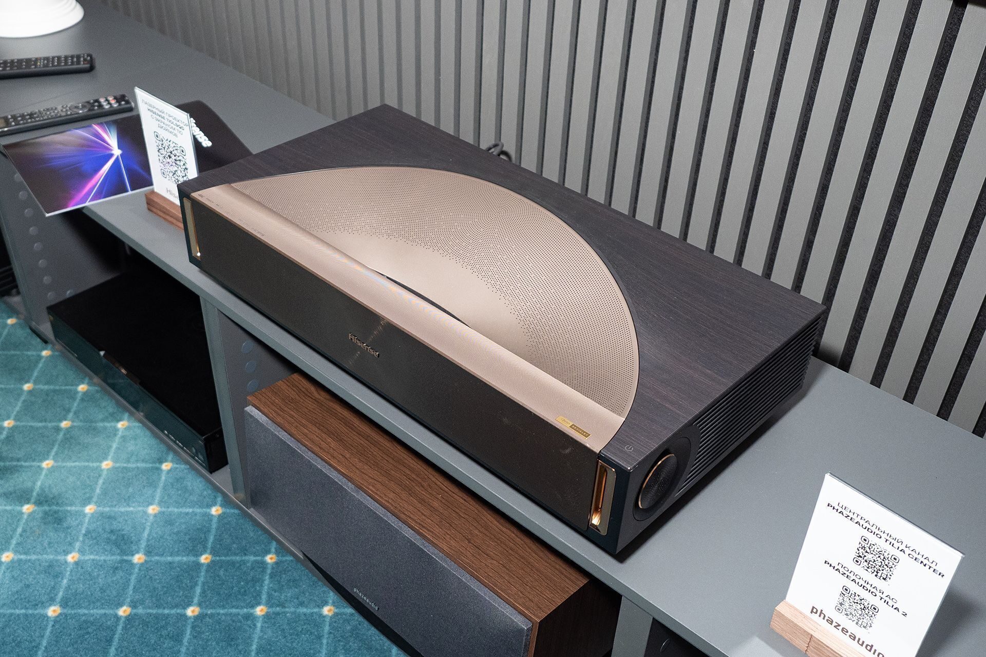 Процессор у модели, естественно, новый и более мощный, есть поддержка всех форматов звука и видео, включая Dolby Vision, чего нет ни у одного проектора других фирм. Есть доступ ко всем популярным стриминговым сервисам, а встроенная аудиосистема разработана совместно с компанией Devialet. Очень интересный аппарат. Кстати, похожий комплект есть и в другой комнате под номером 1110, с чуть большим экраном, но там гвоздь программы другой. О нем мы расскажем чуть позже.
