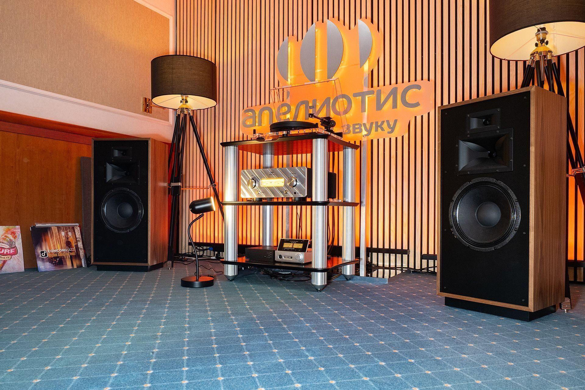 В комнате 611 компания «Апелиотис» с одноименными компонентами предлагает доверься звуку. Что ж, предложение принято: доверяемся, располагаемся в плюшевом кресле и удивляемся, как блестящий в полосочку усилитель феерично управляет акустикой Klipsch Forte.